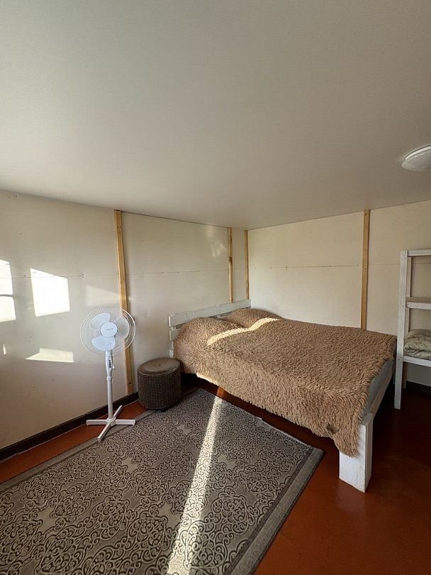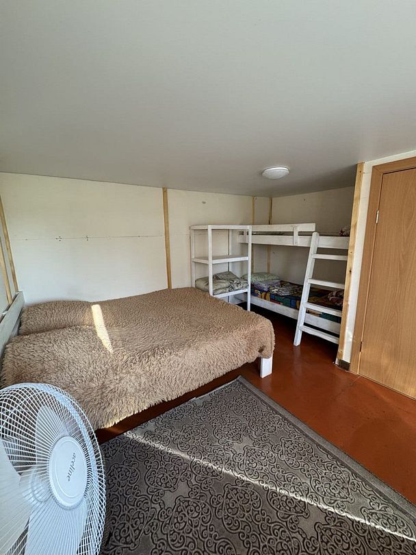 На этаже 3 отдельные комнаты, кухня, туалет и общая комната с диваном, телевизором и большим столом.