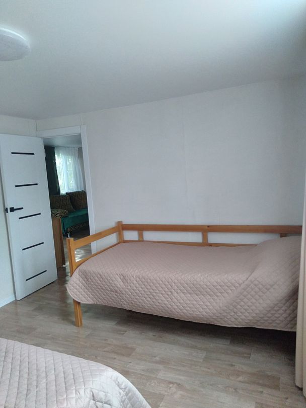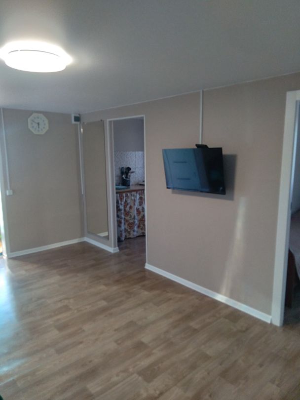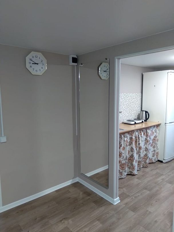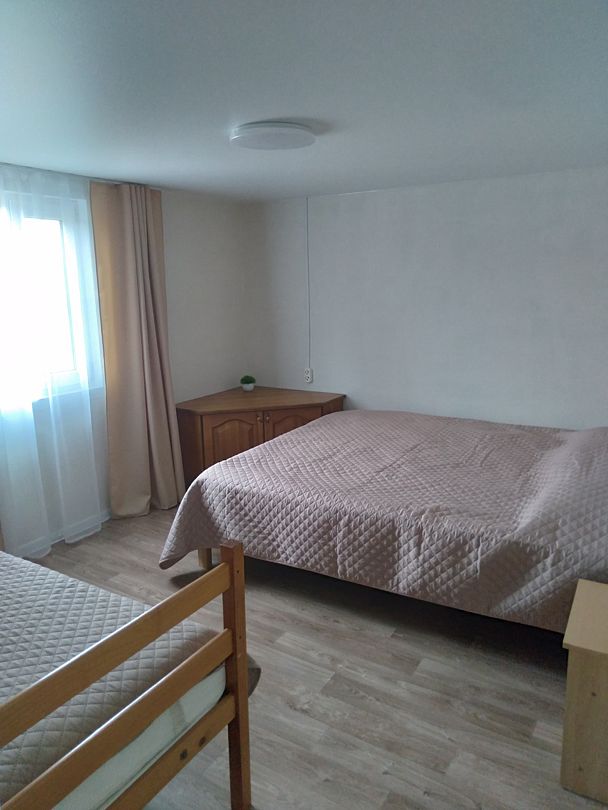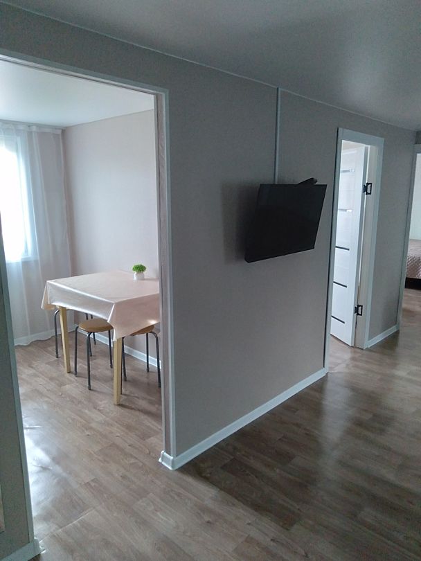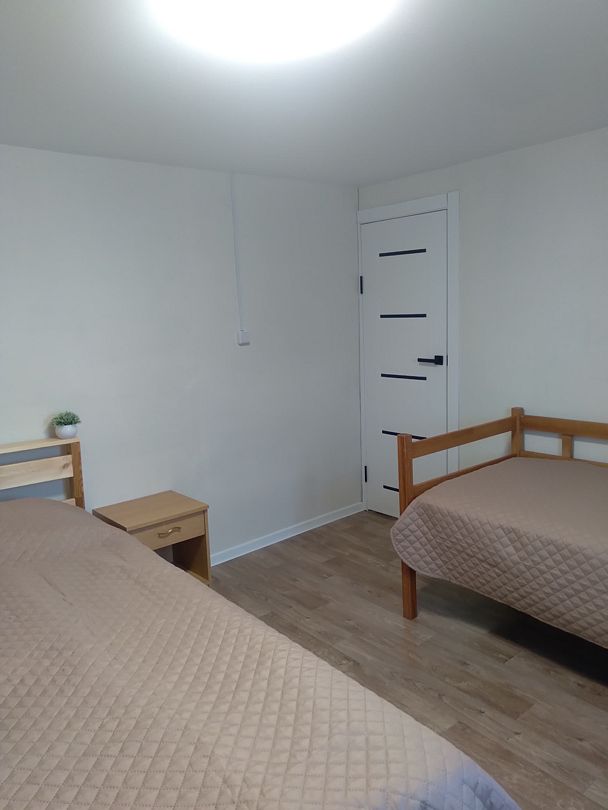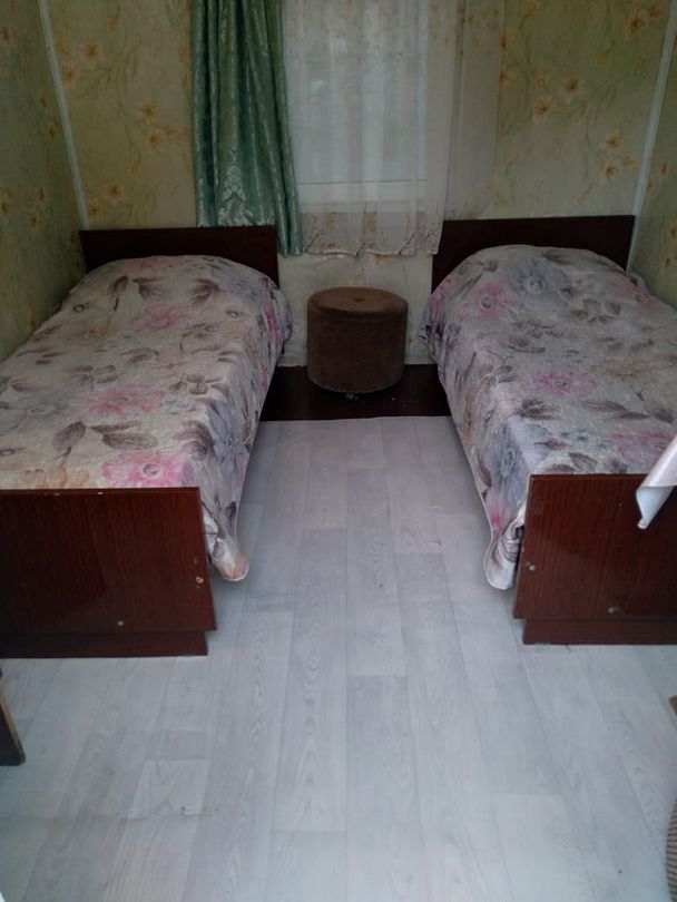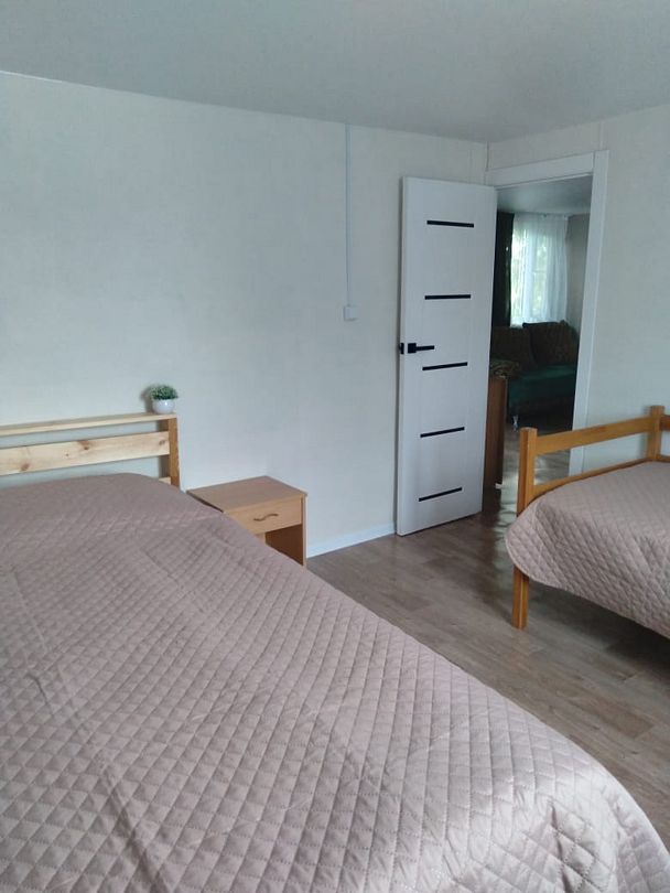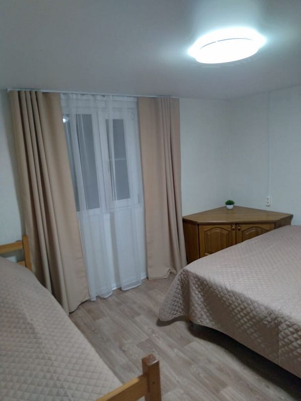 Номер состоит из 2-х комнат. В номере 4 односпальные кровати, постельное белье. Столик, стулья, вешалки для одежды, розетки.