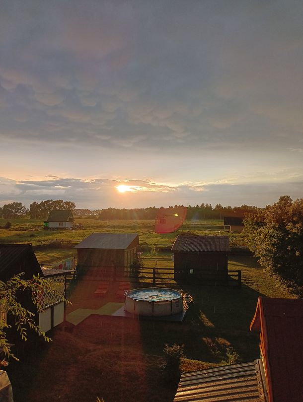 На улице имеется душ, туалет, есть общая кухня. Гости могут посидеть в беседке, взять мангал, поиграть в настольные игры. К услугам гостей — баня на дровах и бесплатная парковка. На территории базы есть бассейн и батут.