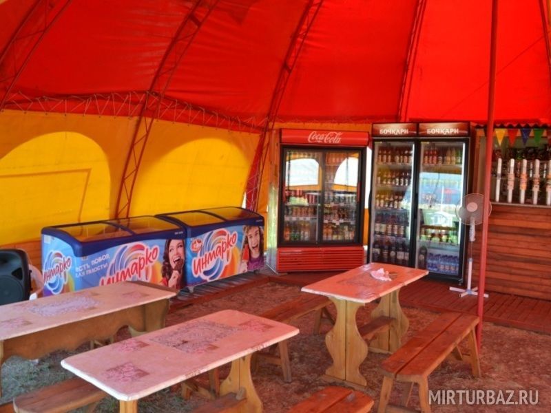 Рядом с территорией пляжа находится бар в шатре и сувенирный магазин.
