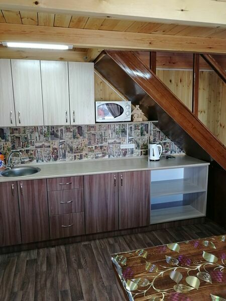 Туалет, душевая, горячая, холодная вода, 2х спальная кровать, диван, постельные принадлежности, телевизор, холодильник, микроволновая печь, чайник, кухонная зона, раковина, посуда, плитка, вентилятор, стол, стулья, на мансарде доп.стол)