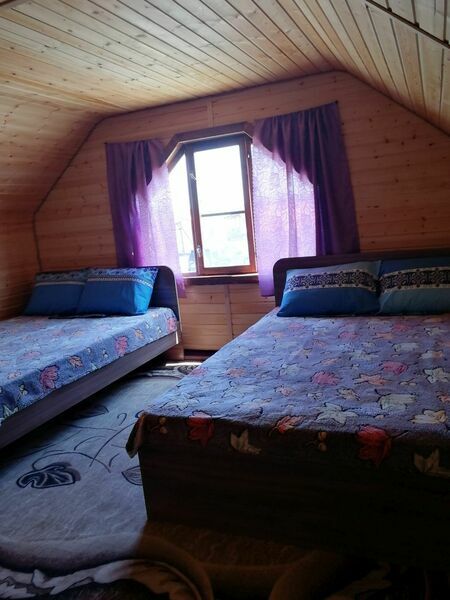 Туалет, раковина, телевизор, кровать 2-х спальная, диван, постельные принадлежности, холодильник, микроволновая печь, чайник, вентилятор, доп. стол на мансарде.