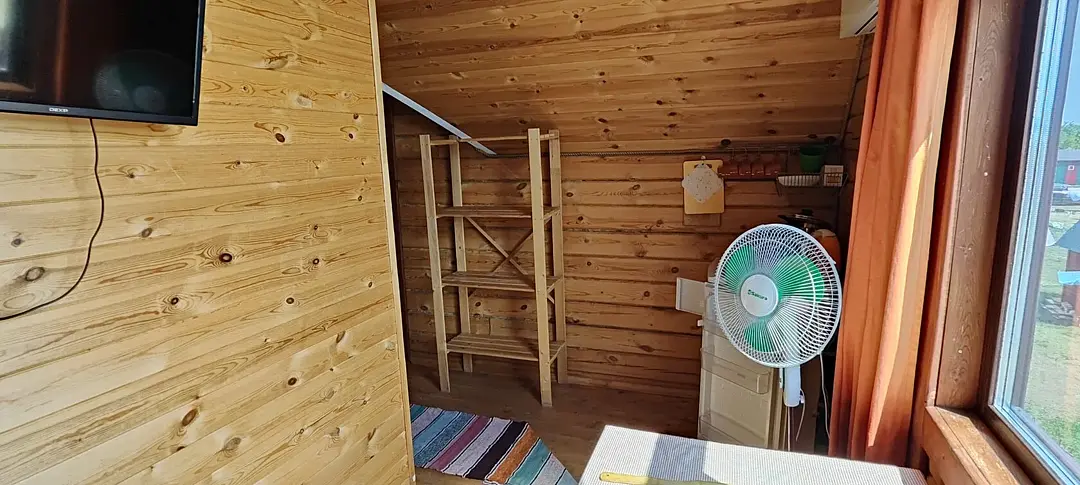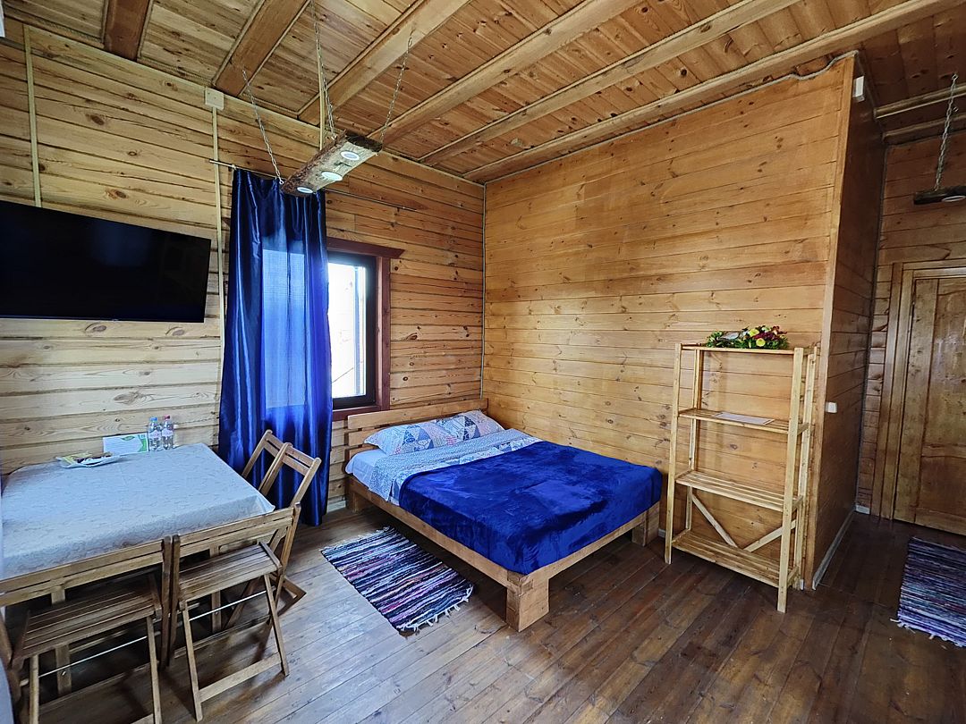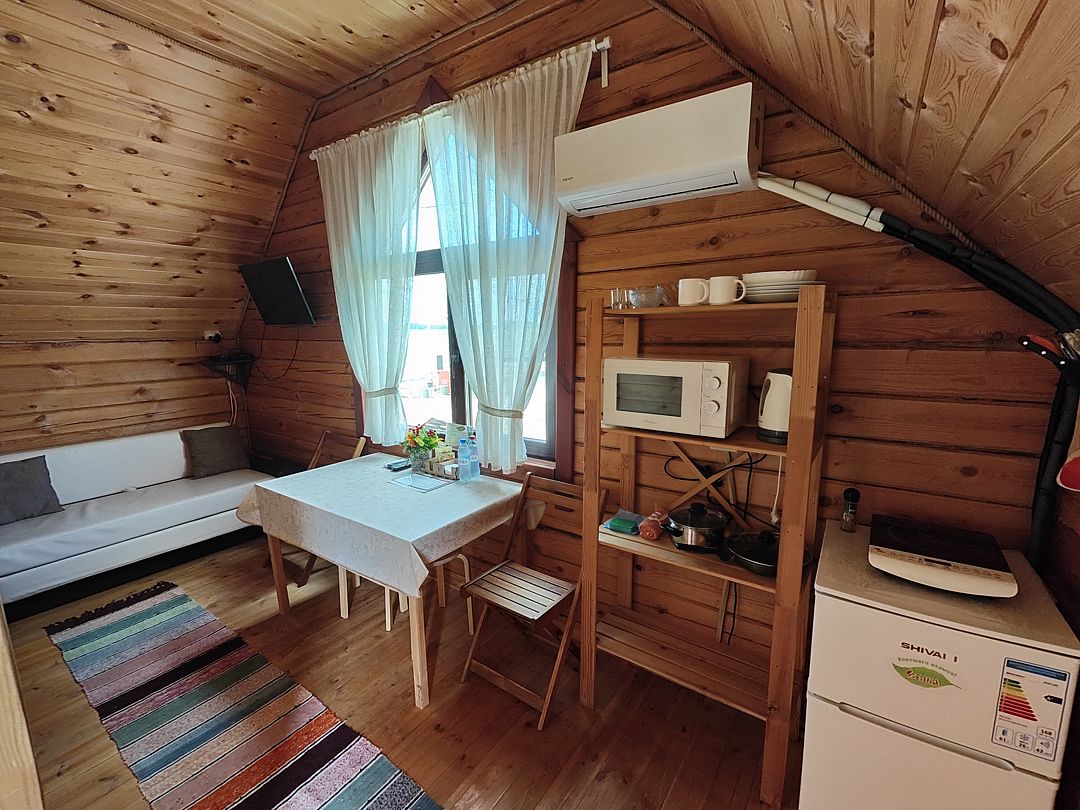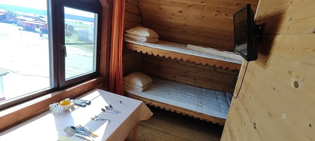 В номере: две широкие двухъярусные кровати, кухонная зона, ванная комната, кондиционер, телевизор.