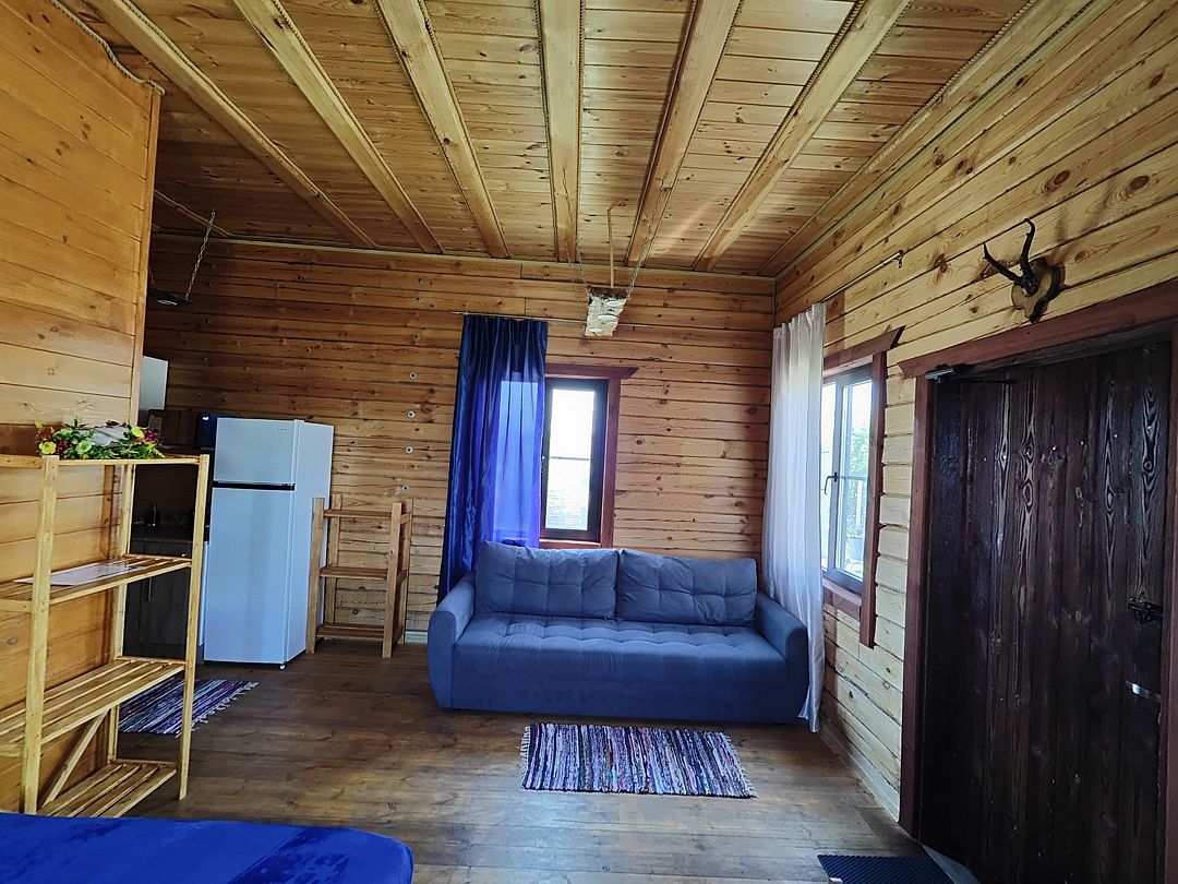В номере двуспальная кровать, диван, кухонная зона с холодильником, зеркало, удобство в номере.