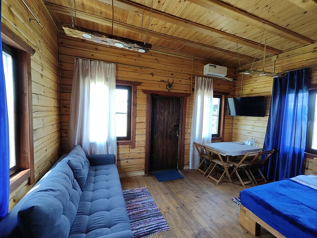 Номер на первом этаже. Внутри: двуспальная кровать, диван, кухонная зона, ванная комната, кондиционер, телевизор.