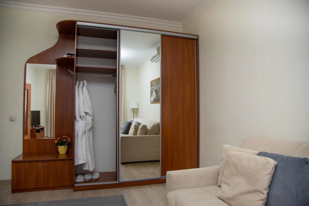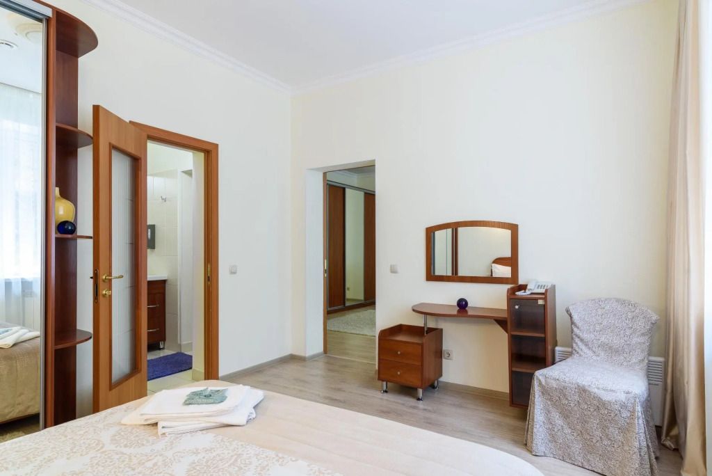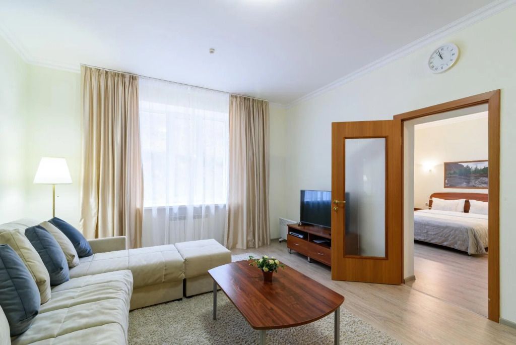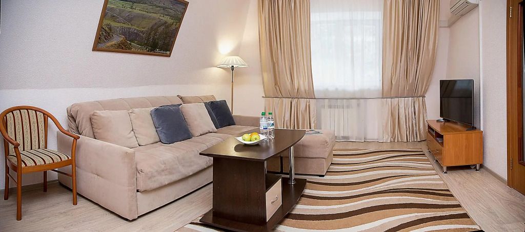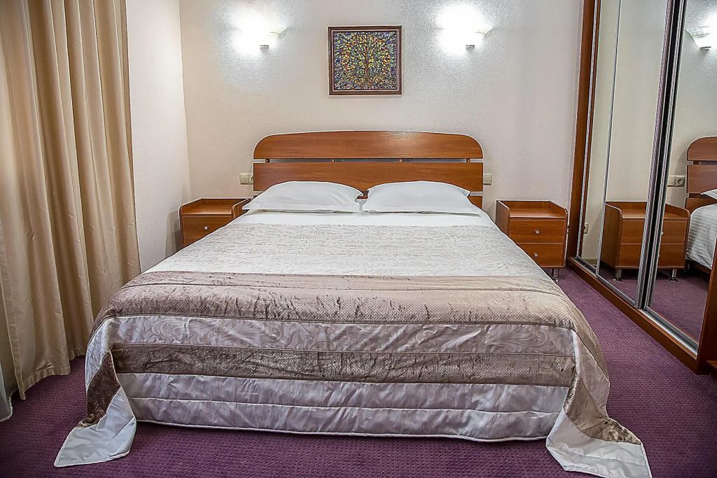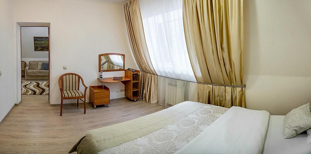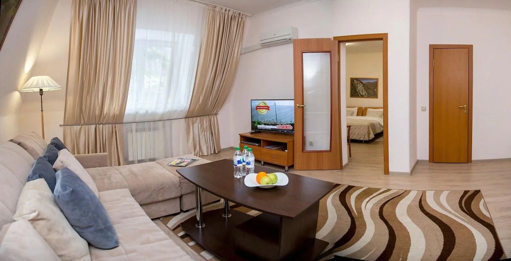 Двухкомнатный номер состоит из уютной гостиной с диваном и спальной комнаты с двуспальной кроватью. Гостям предоставляются махровые халаты, тапочки, бутилированная вода. Номера оснащены всем необходимым для комфортного отдыха.