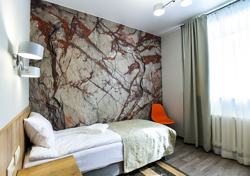 Однокомнатный номер, площадью 19 квадратных метров. Интерьер оформлен в пастельных тонах. Настенные светильники добавляют номеру уюта и тепла.