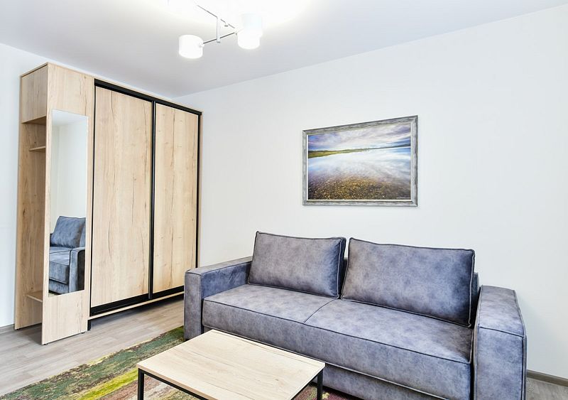 Однокомнатный номер, площадью 20-36 квадратных метров. Интерьер оформлен в пастельных тонах — от воздушного бежевого до прохладного серебристого с темно-бирюзовым цветовым акцентом. Настенные светильники добавляют номеру уюта и тепла.