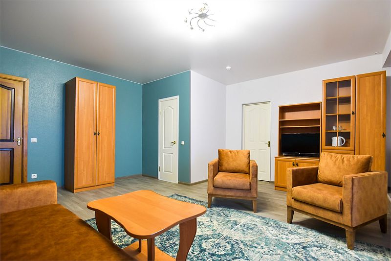 Трехкомнатный номер, площадью 55 квадратных метров. Эта категория прекрасно подойдет для большой семьи или дружной компании. Номер состоит из гостиной, двух спален, санузла и прихожей.