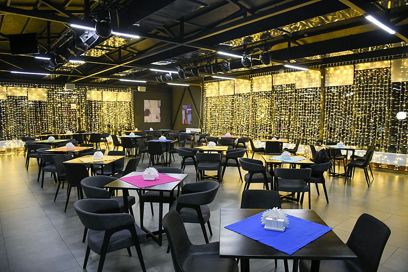 Турбаза располагает роскошным банкетным залом площадью 155 м2, способным вместить до 100 гостей и оборудованным большим экраном, сценой и барной стойкой, предоставляя широкие возможности для организации торжественных церемоний, концертных программ и изысканных банкетов. Вместительная гардеробная зона создает дополнительные удобства для проведения мероприятий любого формата.