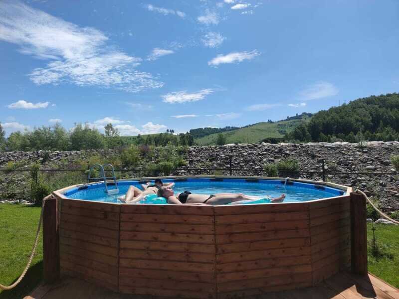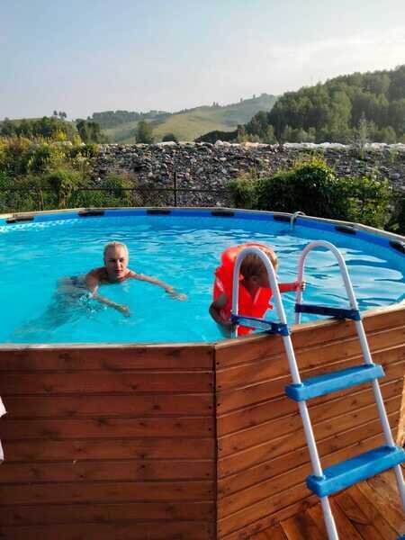 Тип бассейна: открытый бассейн, каркасный бассейнСезонный бассейн на берегу реки в окружении гор, газонов и цветников.