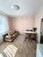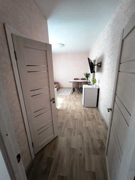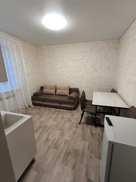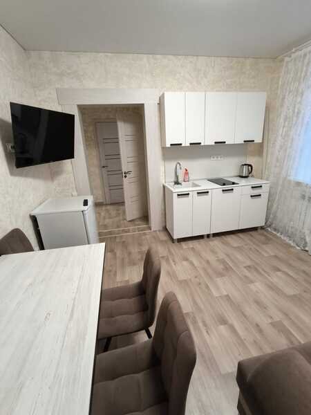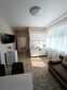 гостиная с обеденной зоной, ТВ, чайник, холодильник, посуда, туалетная комната