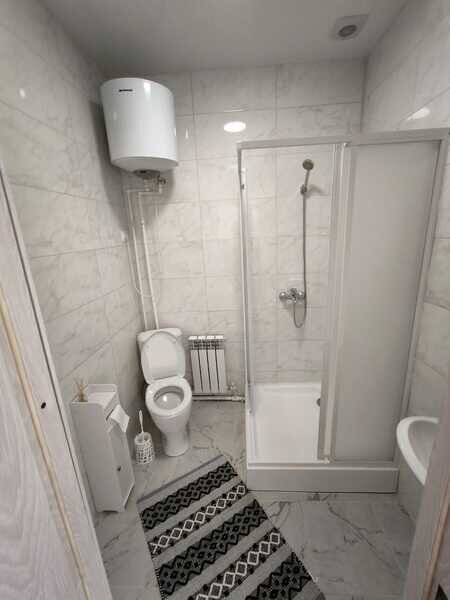 двуспальная кровать, диван, ТВ, чайник, стол, стулья, туалетная комната
