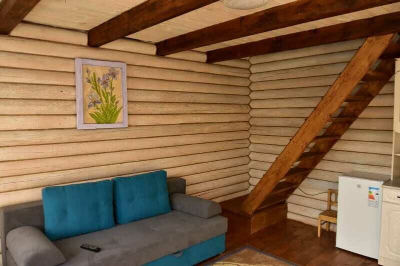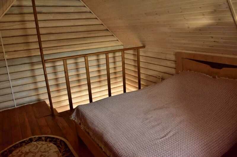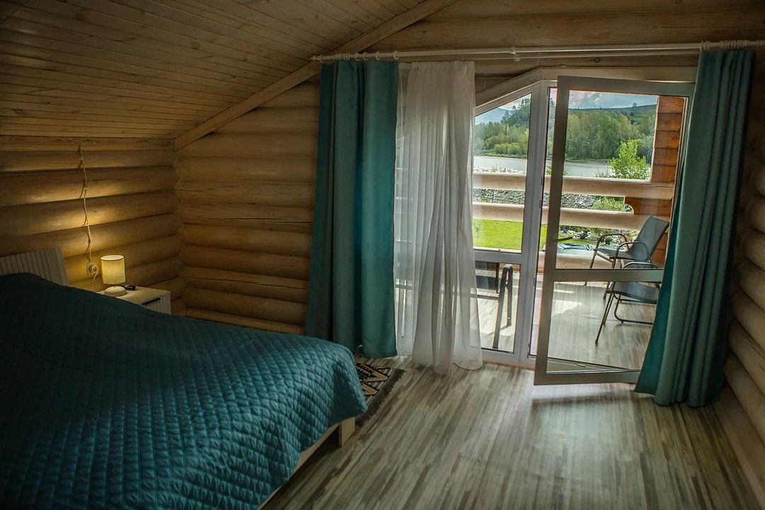 Домик №3: два этажа, гостиная + спальня, туалетная комната, мини-кухня. Балкон с видом на реку.