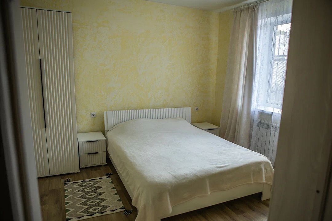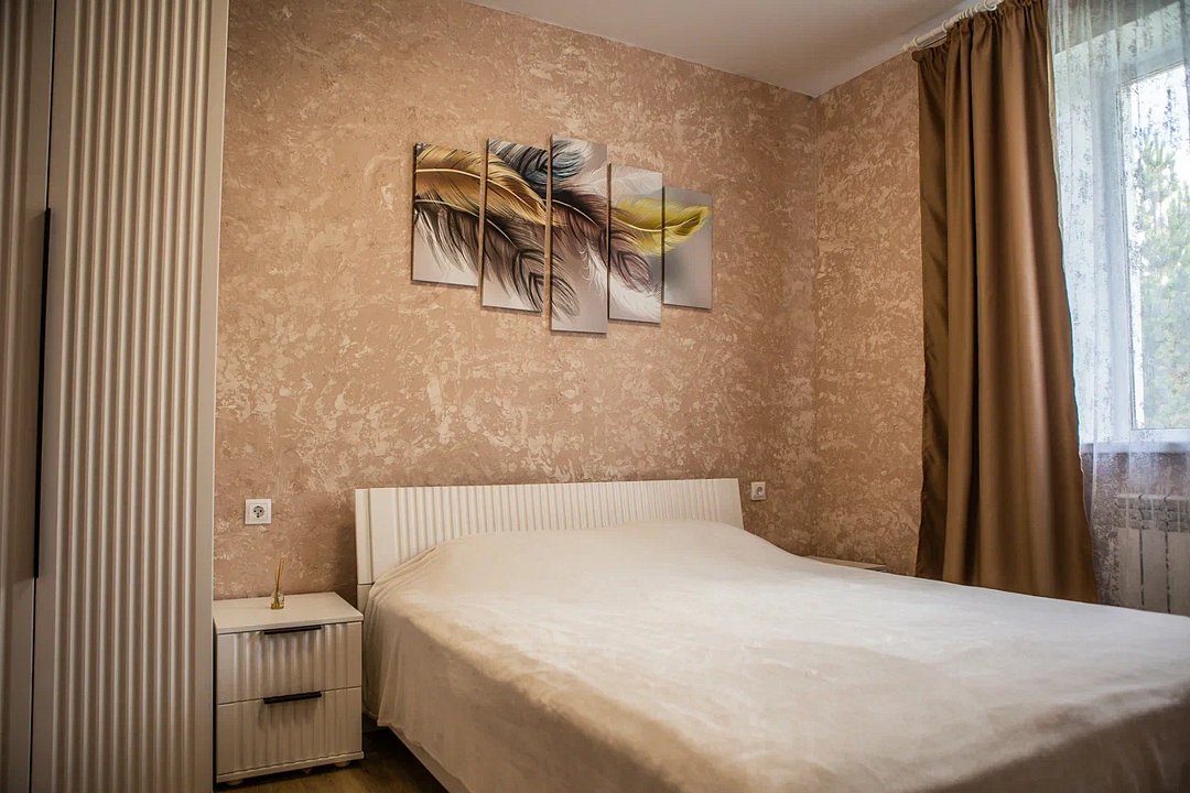 Двухкомнатный номер с двуспальной кроватью, диваном, санузлом и кухней.