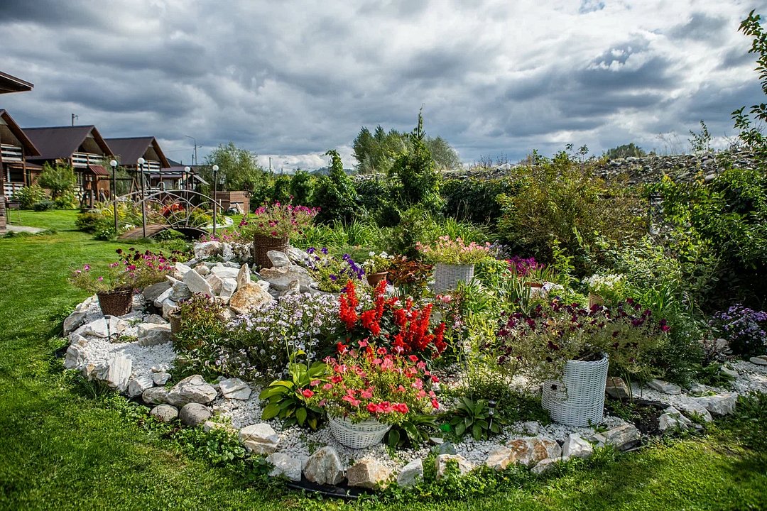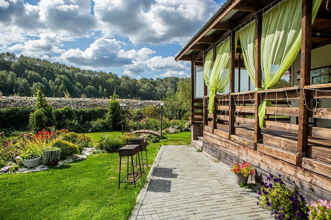 Сезонный бассейн на берегу реки в окружении гор, газонов и цветников.