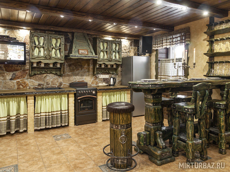 Кухня в гостевом доме Берендей House полностью оборудована для приготовления пищи. При желании гостей возможна доставка ресторанных блюд