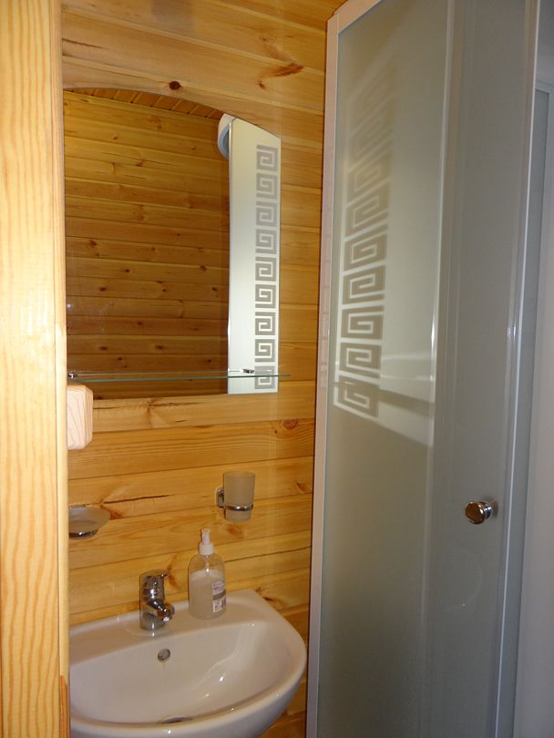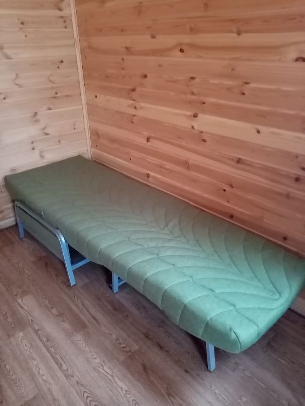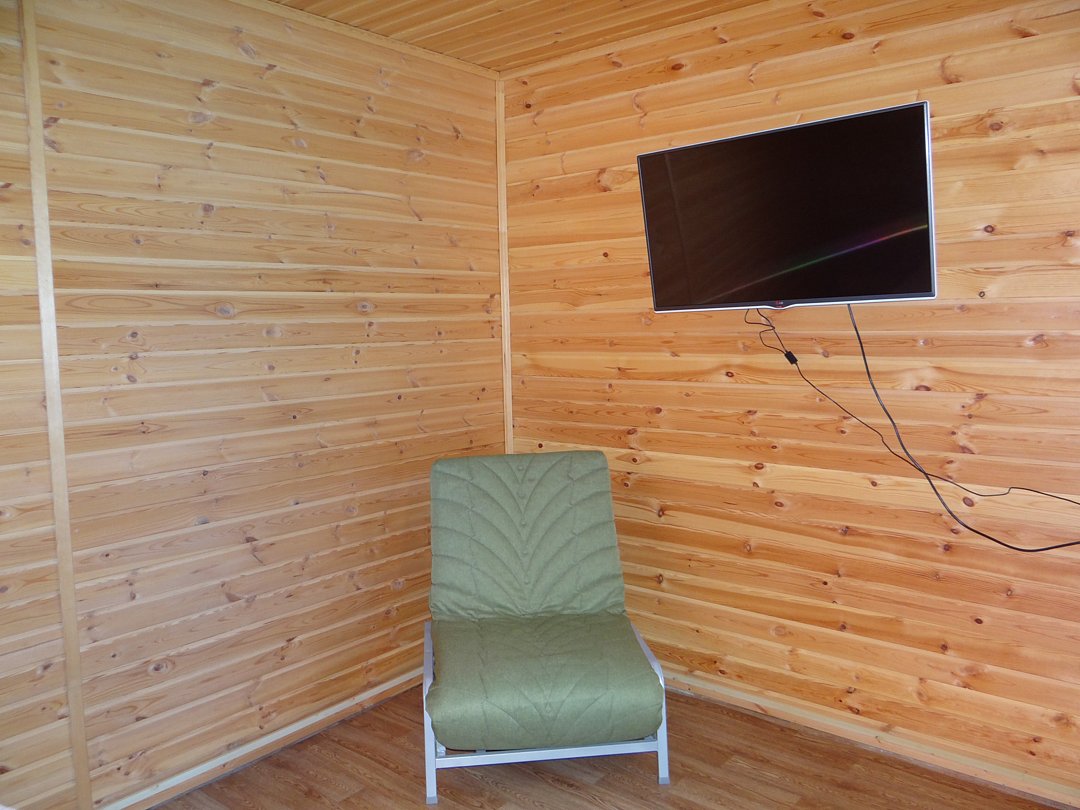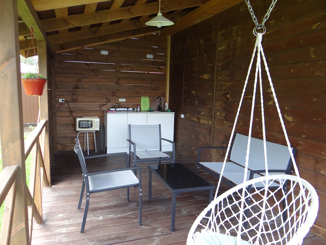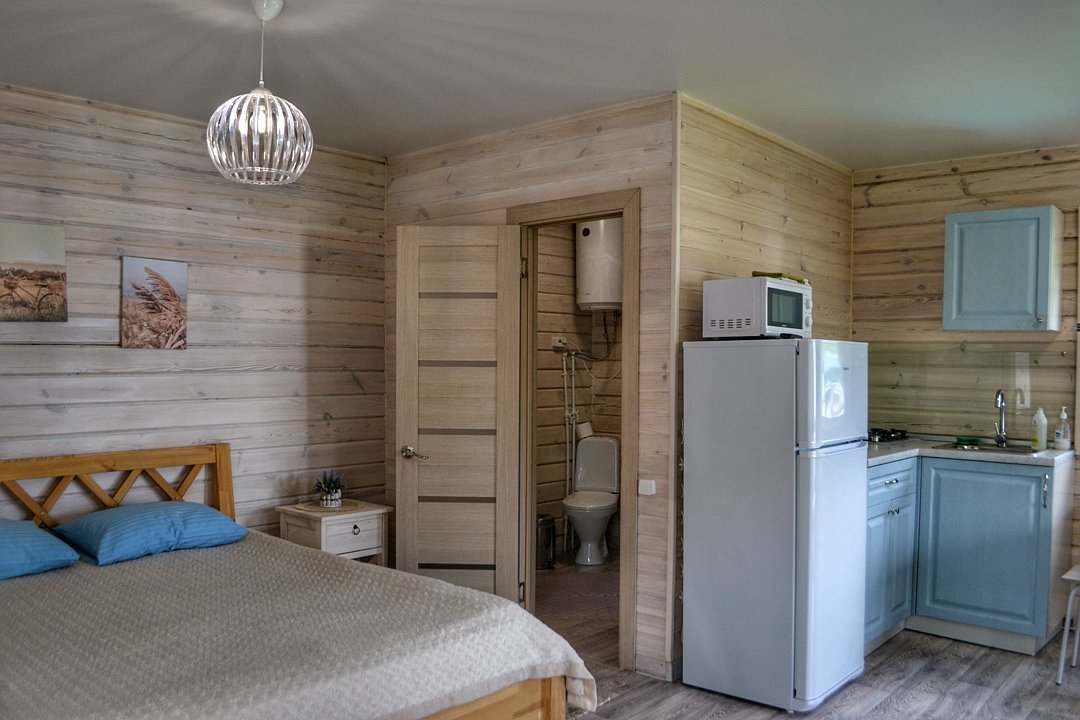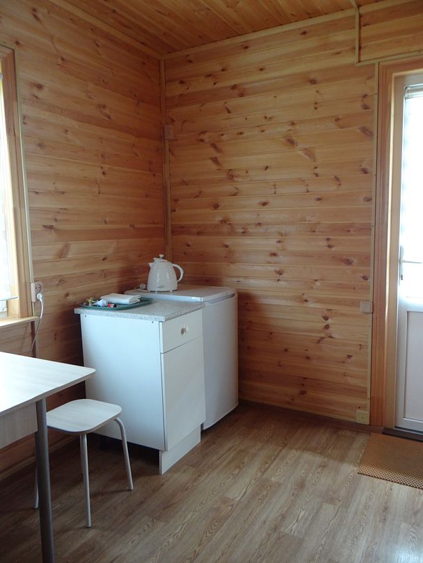 1-этажный дом с террасой — это уютный дом, рассчитанный на 2-3 человек. Есть возможность организовать четвертое спальное место (раскладушка с мягким матрасом). В доме есть двуспальная кровать (160х200) , кресло-кровать, телевизор, обеденная зона, холодильник, чайник, санузел. На террасе расположена кухонная зона (эл.плитка, мойка для посуды, микроволновка), стол и стулья,