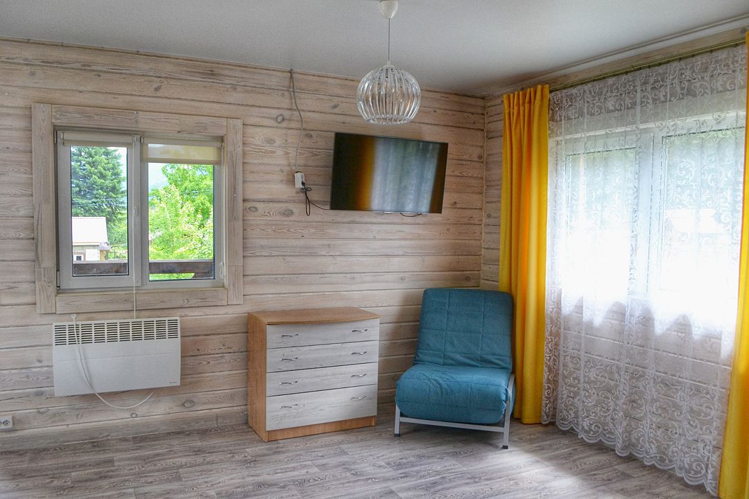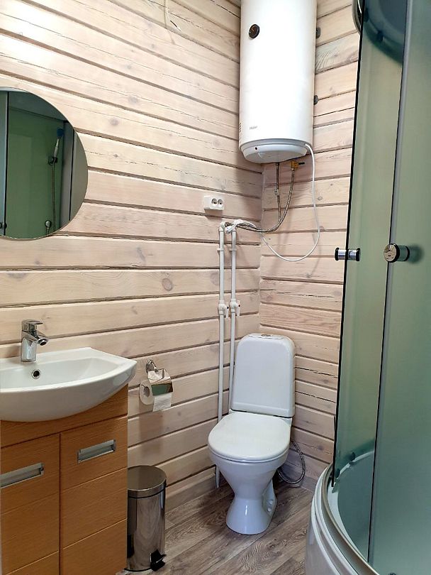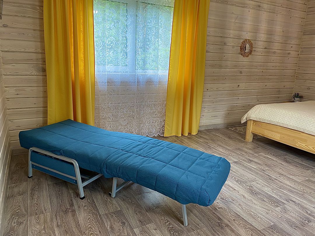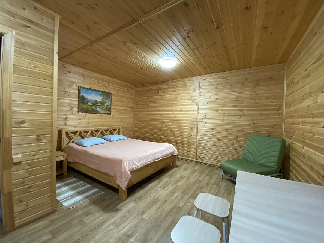 2-этажный дом из бруса с балконом готов принять до 6 человек гостей. На 2-ом этаже расположены двуспальная кровать 160х200, кресло-кровать, телевизор, кухонная зона (холодильник, газовая панель, микроволновка ,обеденный стол, посуда), санузел (душевая кабина, унитаз, раковина). На 1-ом этаже двуспальный диван аскона (спальное место 140х200), кресло-кровать, санузел (унитаз, раковина)