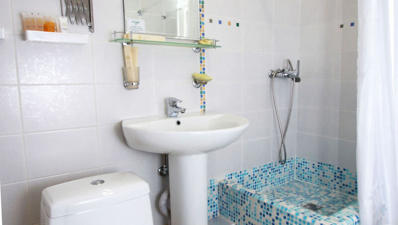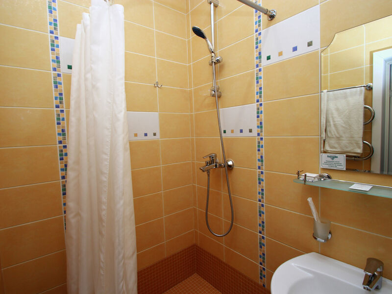 S=13 кв.м., одна 1,5-спальная кровать, тумбочка, полка-зеркало, пуфик, ТВ, чайник, набор посуды, фен, телефон, с/у с душем.