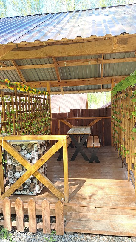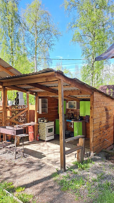 На территории усадьбы оборудована общая беседка-кухня для приготовления и приема пищи. Кухня оснащена газовой плитой, посудой, мойкой, чайником, холодильником, микроволновкой.