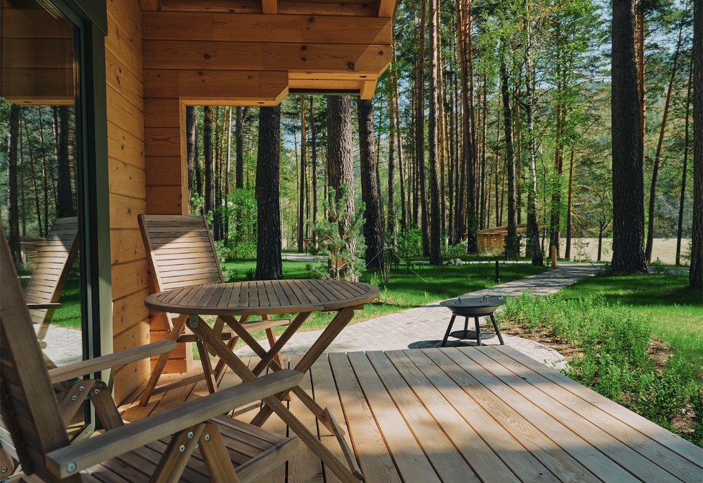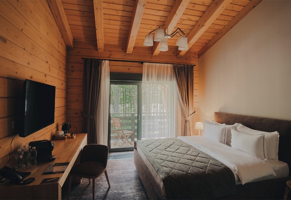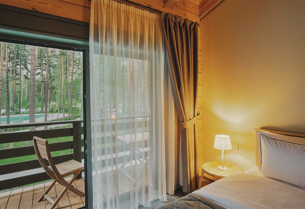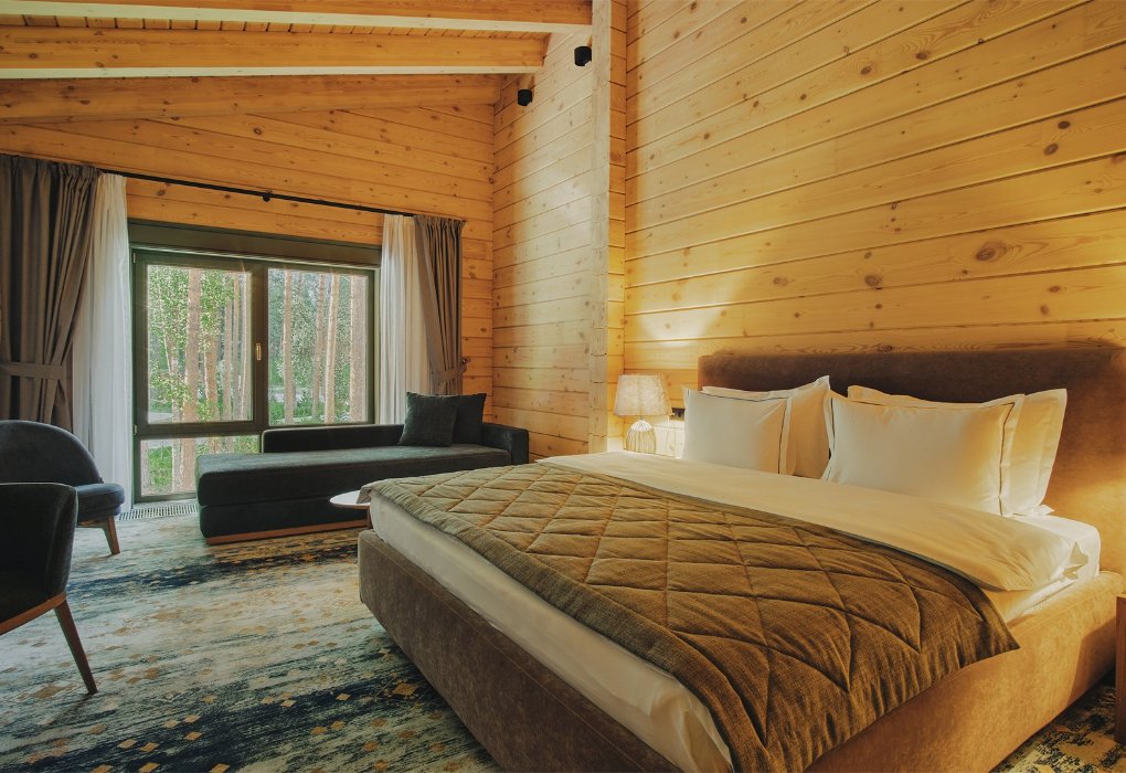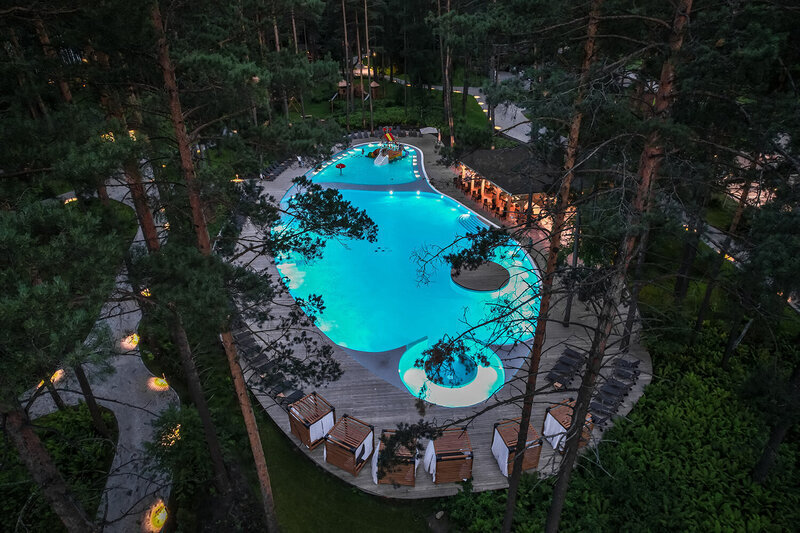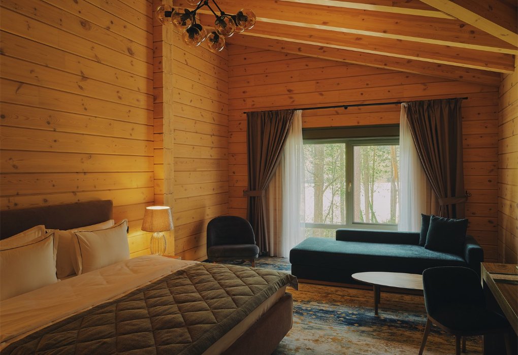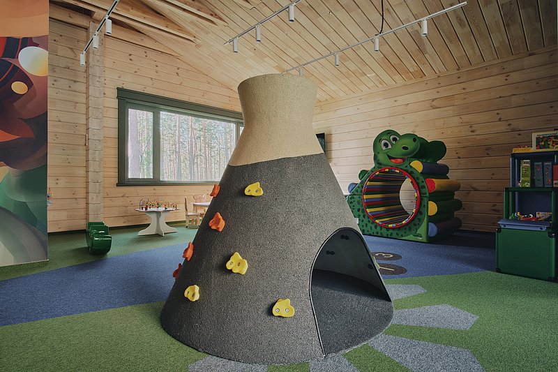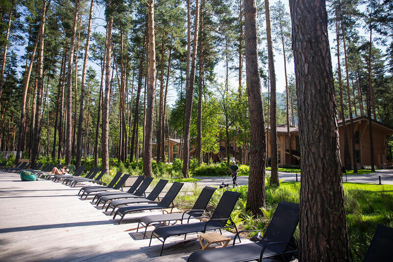 На первом этаже отеля открыт панорамный ресторан авторской кухни «Сосны», а на берегу реки организована барбекю-зона с беседками. К услугам гостей большой уличный бассейн с подогревом, работающий в теплое время года. Действует СПА-центр «Кедр и пар», где гостям помимо посещения бассейна и сауны, предлагаются различные спа-процедуры на выбор. Досуг можно скрасить просмотром фильмов в летнем кинотеатре и в развлекательном центре, где регулярно проводятся различные программы для детей и взрослых. Оборудована теннисный корт, открыт прокат спортинвентаря.