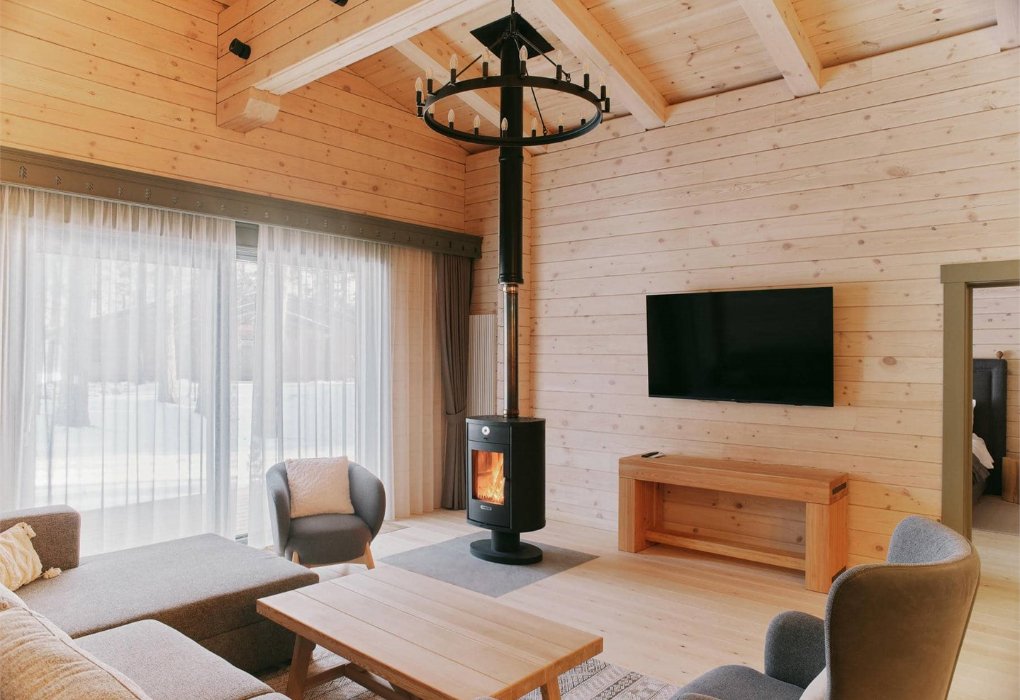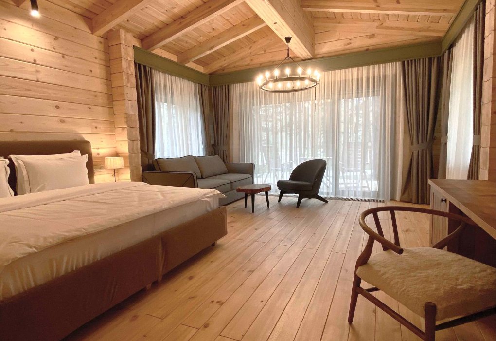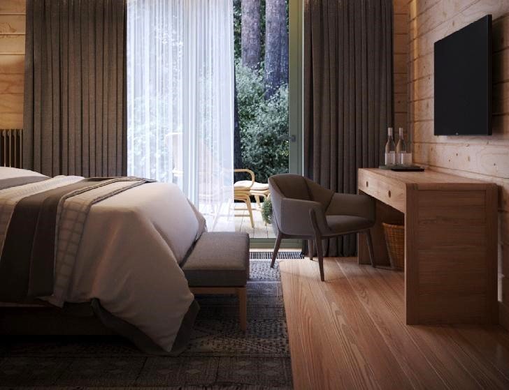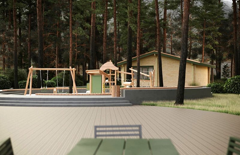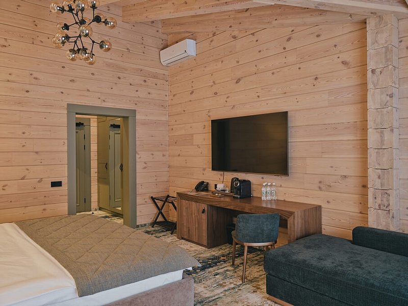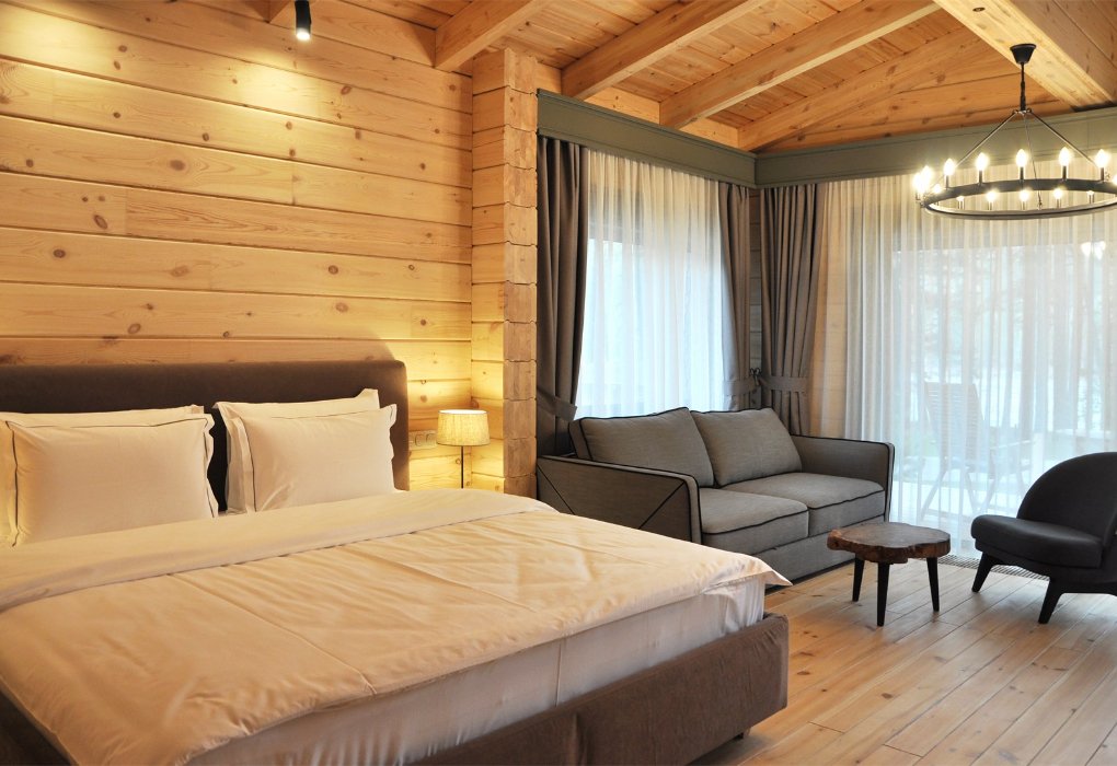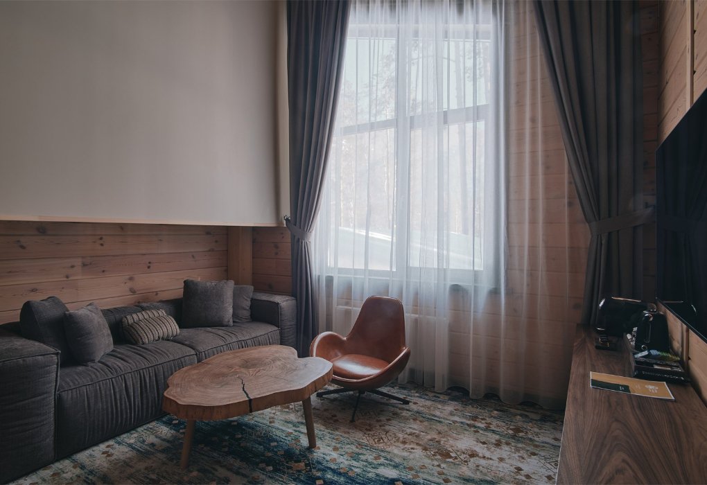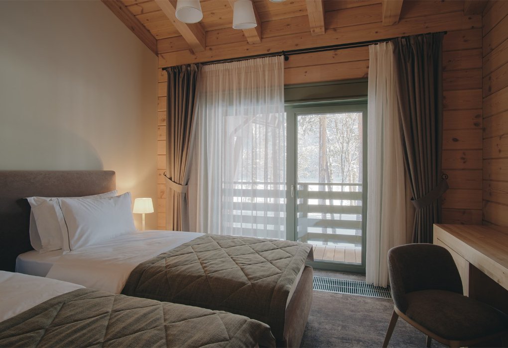 На первом этаже отеля открыт панорамный ресторан авторской кухни «Сосны», а на берегу реки организована барбекю-зона с беседками. К услугам гостей большой уличный бассейн с подогревом, работающий в теплое время года. Действует СПА-центр «Кедр и пар», где гостям помимо посещения бассейна и сауны, предлагаются различные спа-процедуры на выбор. Досуг можно скрасить просмотром фильмов в летнем кинотеатре и в развлекательном центре, где регулярно проводятся различные программы для детей и взрослых. Оборудована теннисный корт, открыт прокат спортинвентаря.