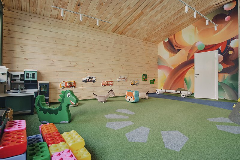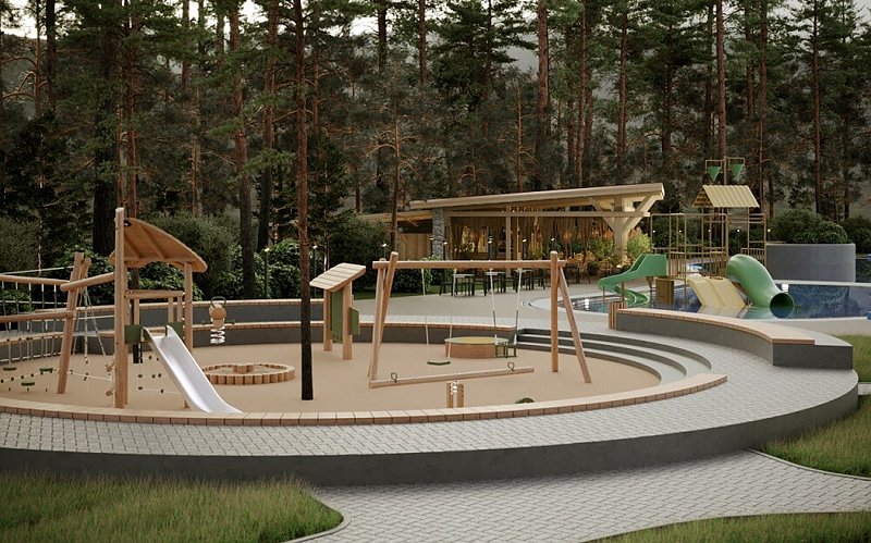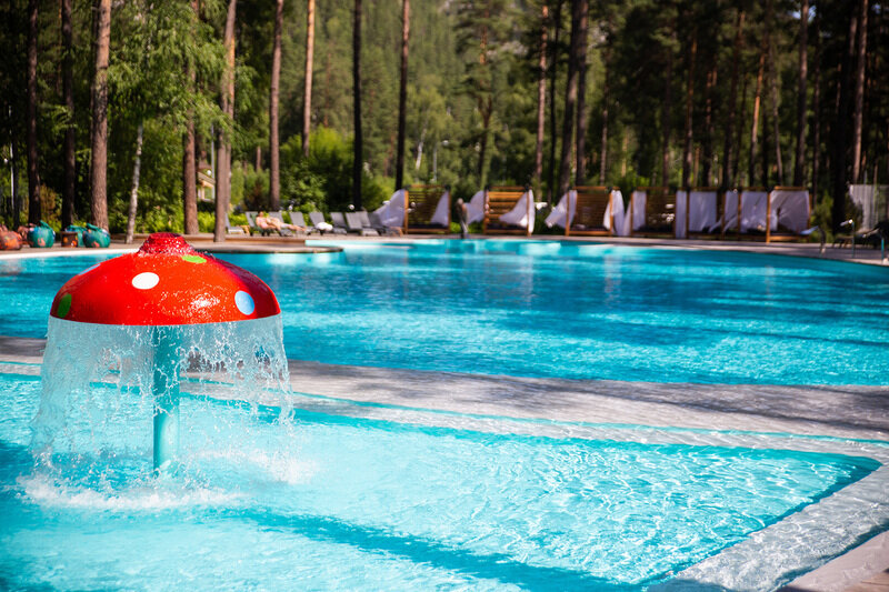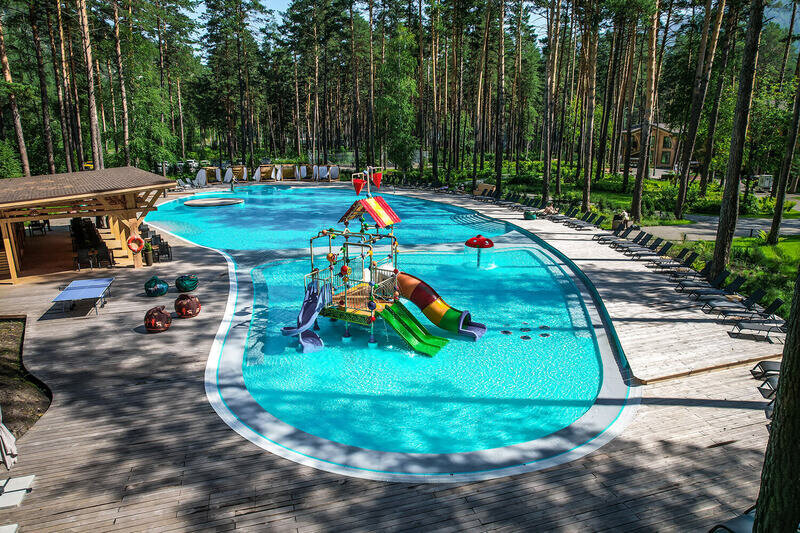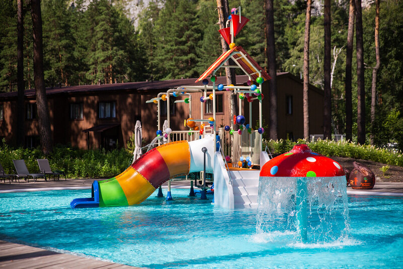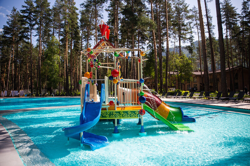В бассейне предусмотрена безопасная детская зона с аттракционами и весёлыми горками.