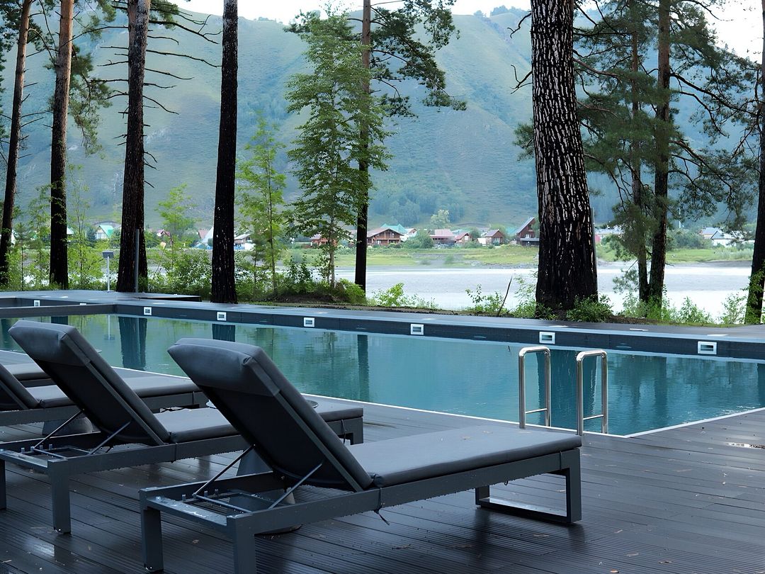 Отдельно стоящие домики 40м2 в формате Шале с кухонной зоной и двуспальной кроватью Double King Size, с личной открытой террасой в 21,5 м2, где можно приятно провести время семьей любуясь Манжерокскими порогами. Допустимое размещение 2+2: - 2 взрослых гостя - 1 ребенок от 0 до 6 лет (без доп.места бесплатно) - 1 ребенок на доп.месте от 6 до 18 лет с доплатой Отель "Хвоя в горах" расположен непосредственно на берегу р. Катунь, напротив известных Манжерокских порогов, которые завораживают своей силой и природной мощью. В стоимость включено: - континентальный завтрак, - двухэтажная детская игровая комната, - анимация и мастер-классы, - комьюнити-зона на территории отеля, - в зимнее время - трансфер до горнолыжного комплекса Манжерок, - в летнее время - подогреваемый теплый бассейн с видом на р.Катунь.Услуги и удобства