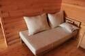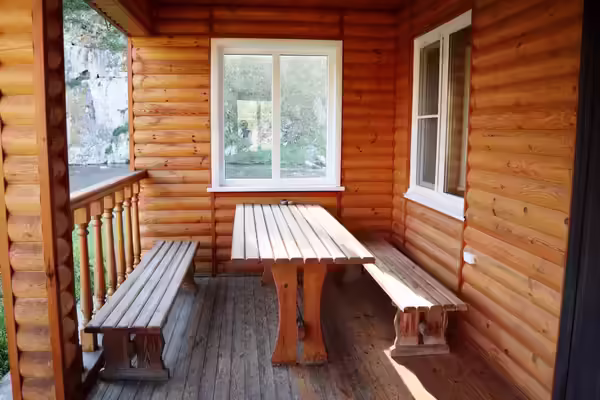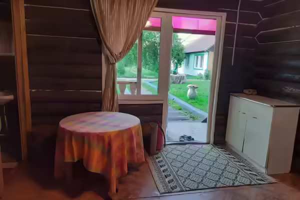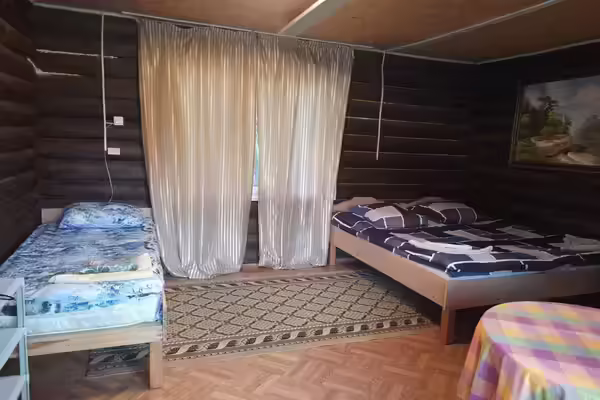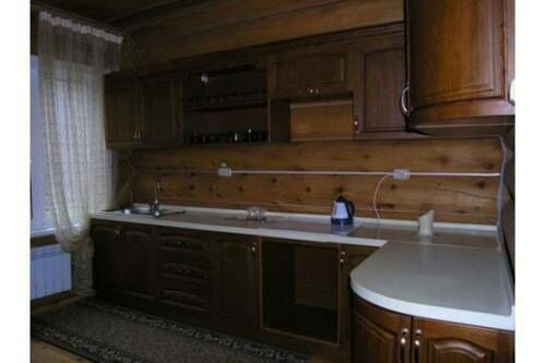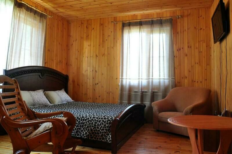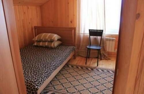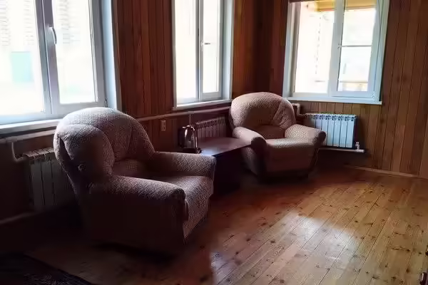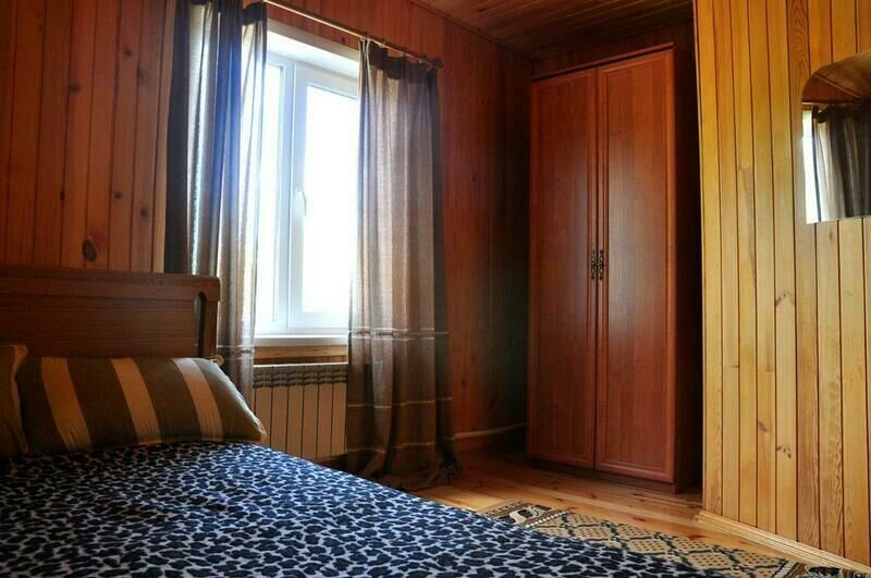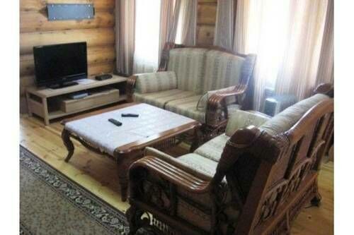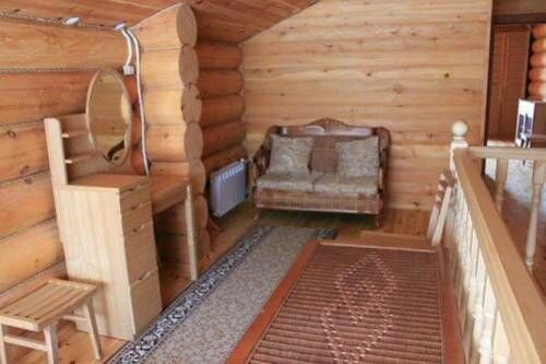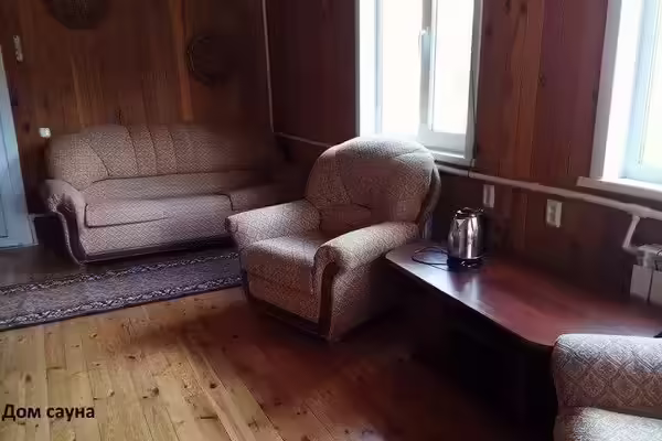 Просторный коттедж из натурального кедра с полноценной кухней и бытовой техников. Есть общая зона отдыха с мягкой мебелью и кабельным ТВ.