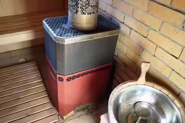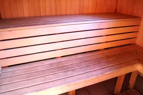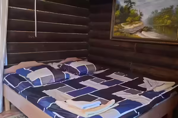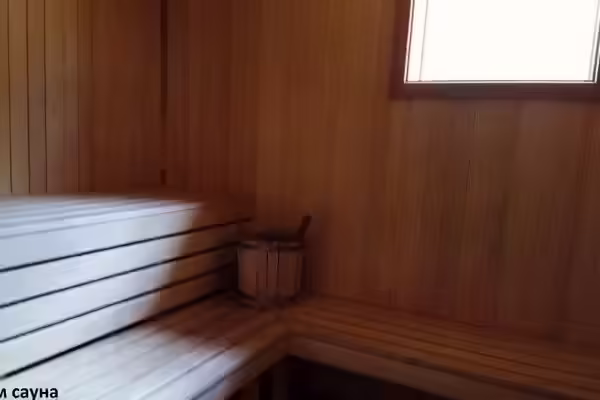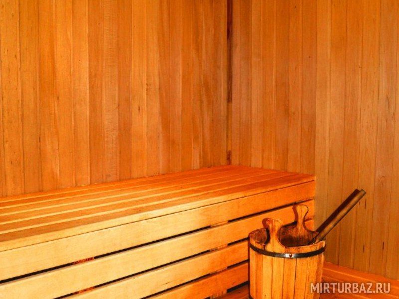 Двуспальная кровать, мягкий уголок, шкаф для одежды, холодильник, чайник, ТВ, санузел, сауна.