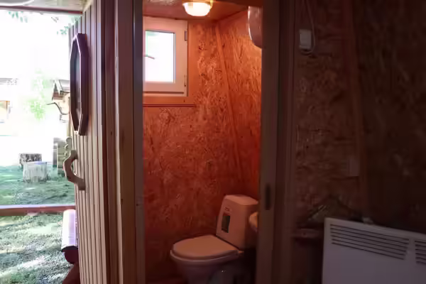 Уютный 3-хместный дом, для тех кто ценит тишину и уединение. В доме есть туалет и раковина. Душ находится в здании гостиницы