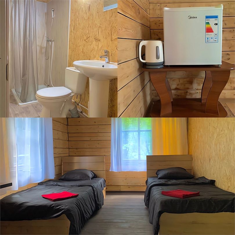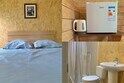 Внутри домика расположена комфортная кровать 140х200, шкаф, холодильник, чайник, телевизор, микроволновая печь, душ с горячей/холодной водой, туалет, ванные принадлежности.