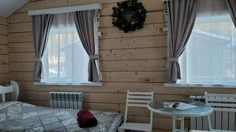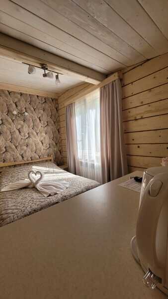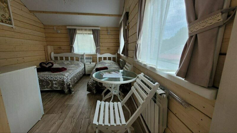 Тип номера "Превосходный" (Delux). Просторный, светлый номер 20 кв. метров, с собственным сан-узлом, душевой и умывальником. В номере два больших окна и балкон. Вид из окон на сосновый лес и горы.