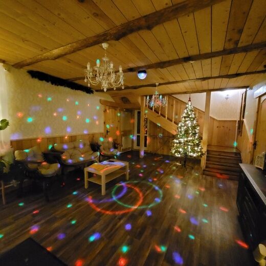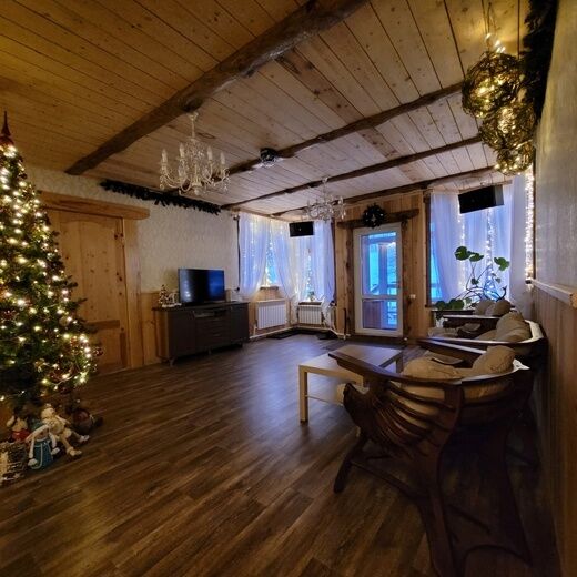 Все 6 комнат выполнены в ЭКО-стиле из натуральной древесины. Холл на 1 этаже можно использовать, как банкетный зал на 20-26 человек, но комфортно до 15 человек. Холл оснащен световым оформлением (светомузыка), который украсит любой праздник.