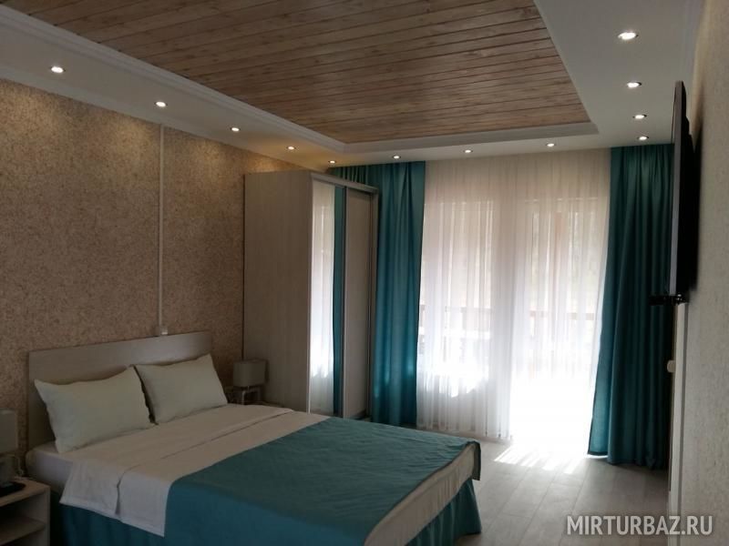 2 этаж 20 кв.м.: в номере королевская 2 спальная кровать(2м.*2.20м), диван 2 спальный, санузел, душевая 8 кв.м. , мебель, TV, большой балкон, столик с креслами, холодильник, посуда, чайник. Вид с балкона на бассейн с фантаном и реку Катунь.
