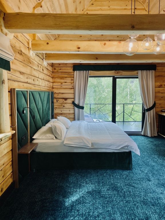 Просторное и стильное шале на первой линии с панорамными окнами подарит живописный вид на парк маралов и горы Алтая. В шале есть все для качественного отдыха и комфортного сна: одна двуспальная кровать с ортопедическим матрасом, невесомое одеяло, климат-контроль, Smart TV, блэкаут шторы, приглушенный теплый свет, чайная зона и современная ванная комната. Натуральные материалы в интерьере создают уютную и теплую атмосферу, а панорамные окна позволяют наблюдать за величественными маралами в любое время суток, погружаясь в единение с природой. Всем гостям предоставляется услуга персонального батлера, который будет на связи в круглосуточном режиме и выполнит любые просьбы. Идеально для тех, кто ценит гармонию природы и комфорт.