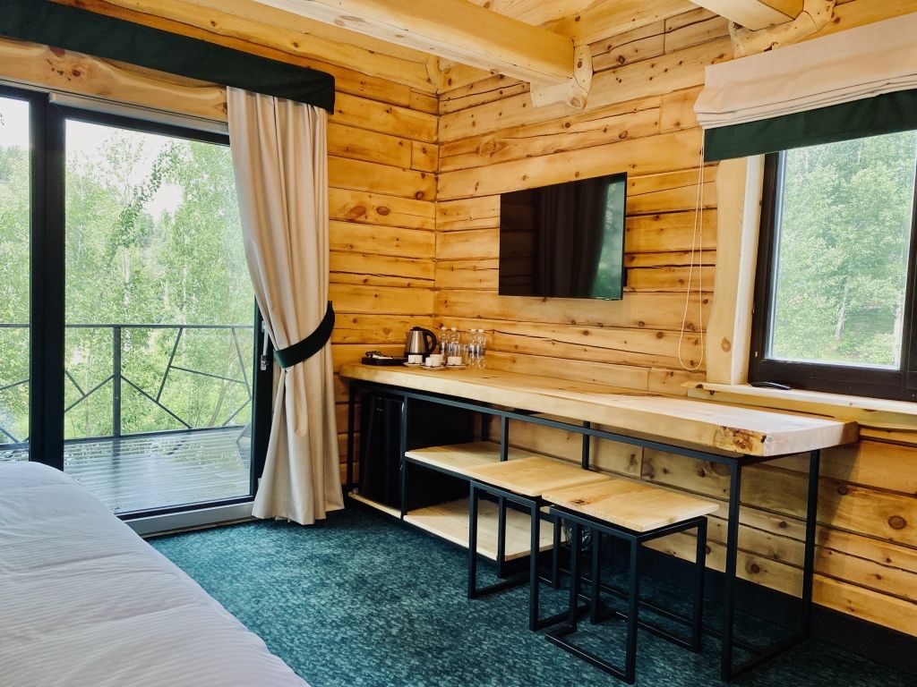 В номере располагается большая двуспальная кровать, ТВ, письменный стол. Все удобства в номере. Панорамные окна позволят наблюдать за величием гор в любое время суток Вашего отдыха.