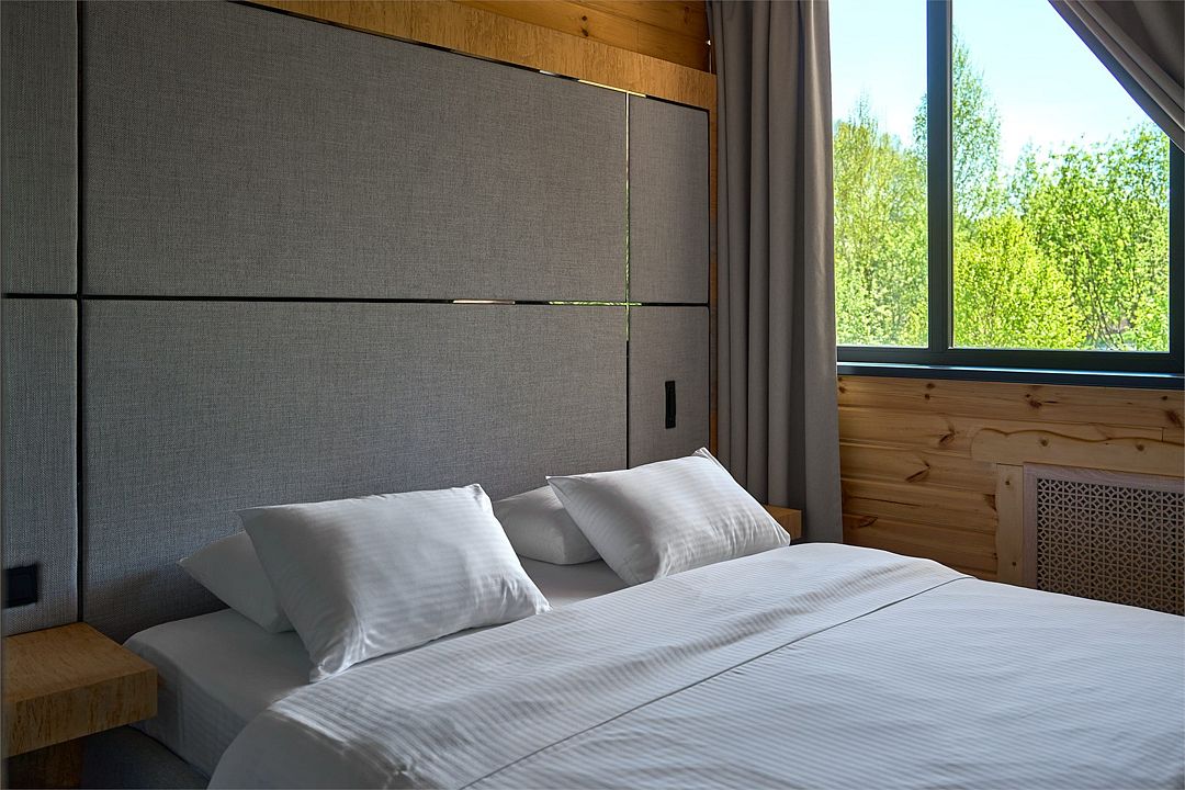 Просторная двухэтажная вилла люкс из массива натурального дерева с большим панорамным окном, выходом на собственную террасу и видом на лес. Интерьер выполнен в классическом стиле с элементами лофта. Дом оснащен всем необходимым для комфортного проживания семьи или компании друзей: две спальни с одной двуспальной и двумя односпальными кроватями с ортопедическими матрасами, мягким белоснежным бельем, кондиционером, Smart TV, блэкаут шторами, чайно-кофейной зоной и функциональной ванной комнатой. Всем гостям предоставляется услуга персонального батлера, который будет на связи в круглосуточном режиме и выполнит любые просьбы.