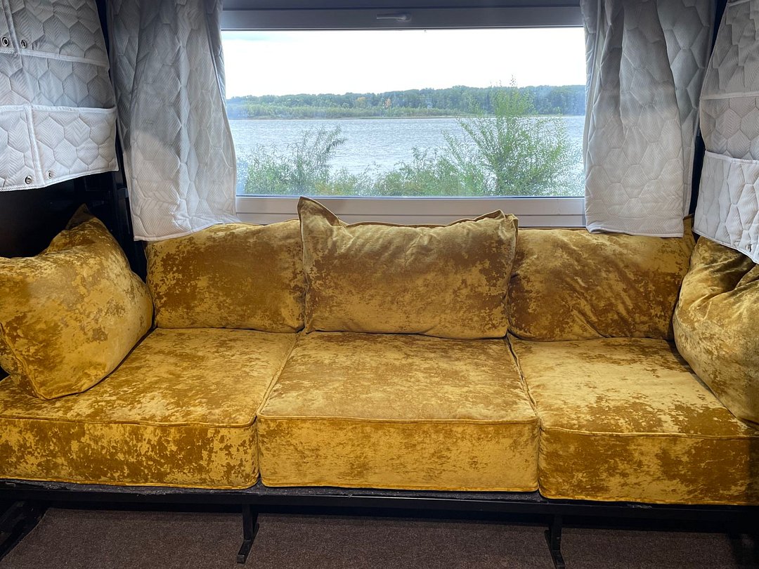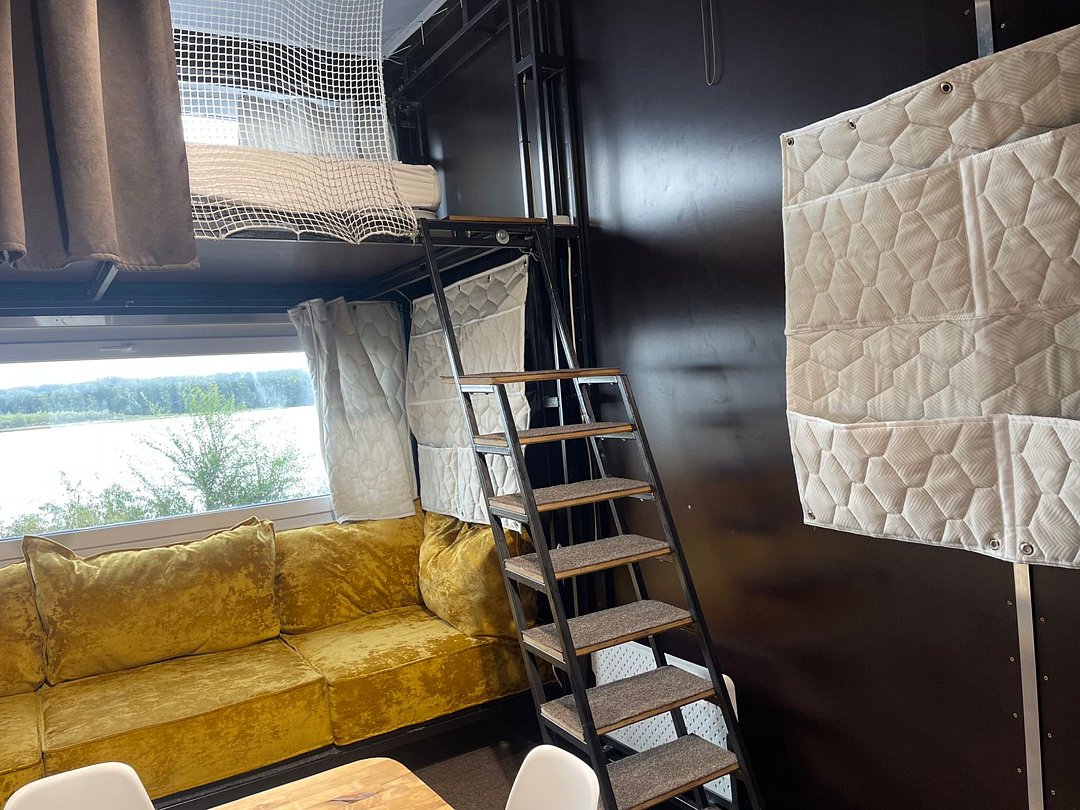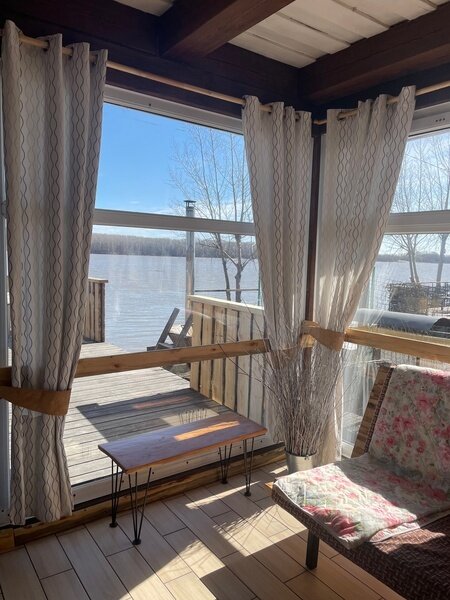 Плот для рыбаков, охотников и искателей приключений. Внутри есть 4 кровати, постельное белье, полотенца. А также плита, кухня, раковина, столовые приборы, посуда, печка-буржуйка, туалет (унитаз), вода 2 тонны. Электричество — есть освещение, можно зарядить телефон. На плоту есть баня!