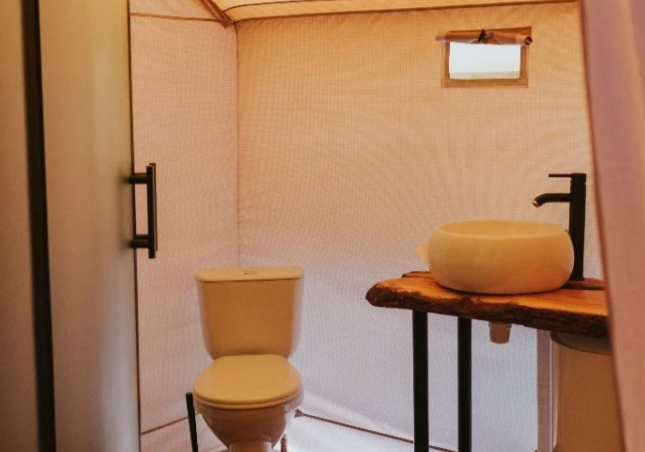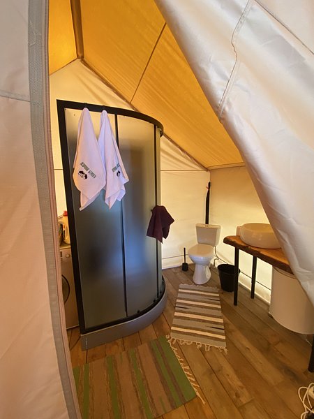 - в каждом тенте туалет и душ со всеми удобствами, а также фен, гели для душа и шампуни.