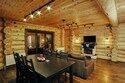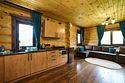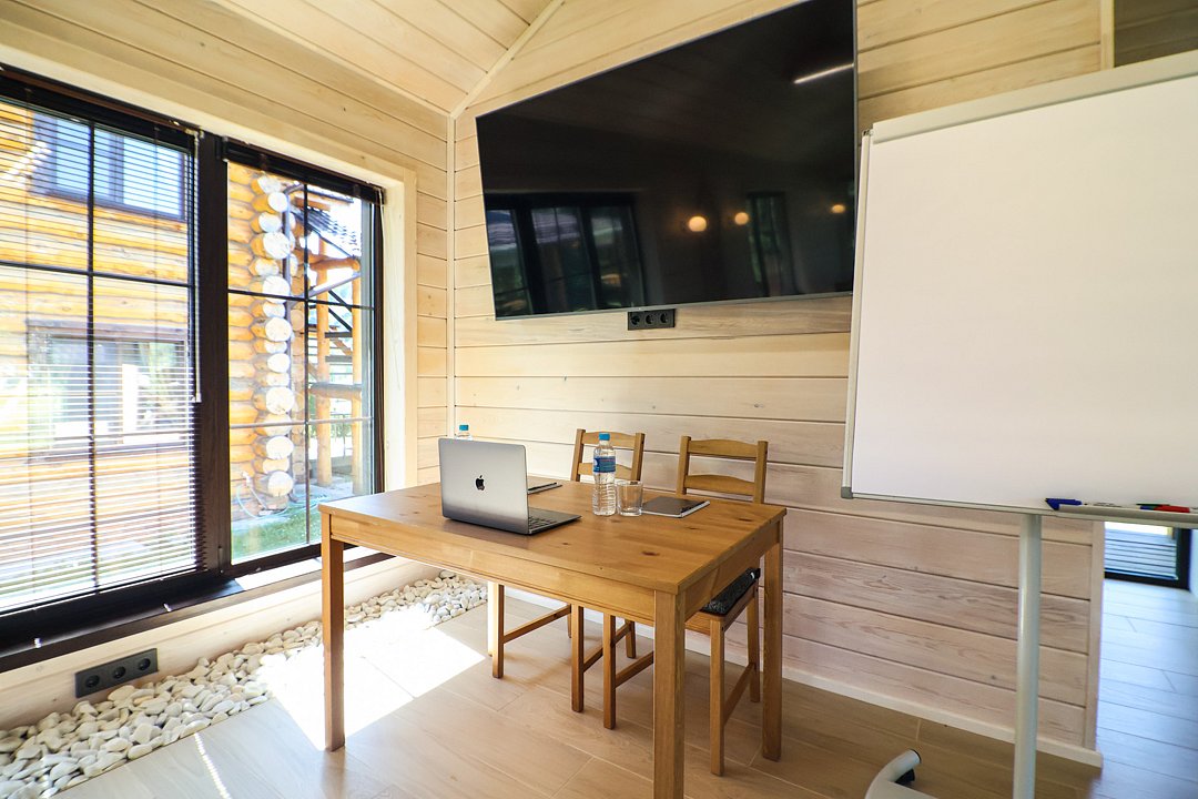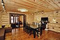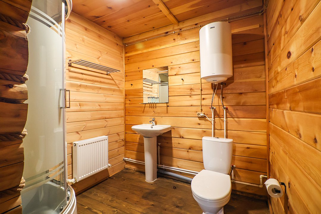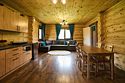 1-й этаж коттеджа «Кедровый терем». В коттедже кухня, гостиная, две спальни и два санузла. Большая собственная терраса с мебелью и видом на реку. Общая площадь - 90м², подходит для семьи или компании до 8 человек.