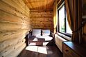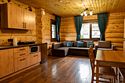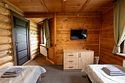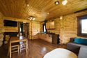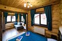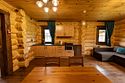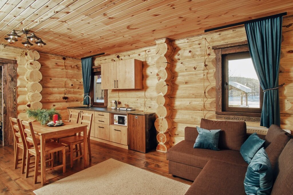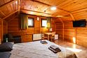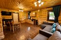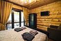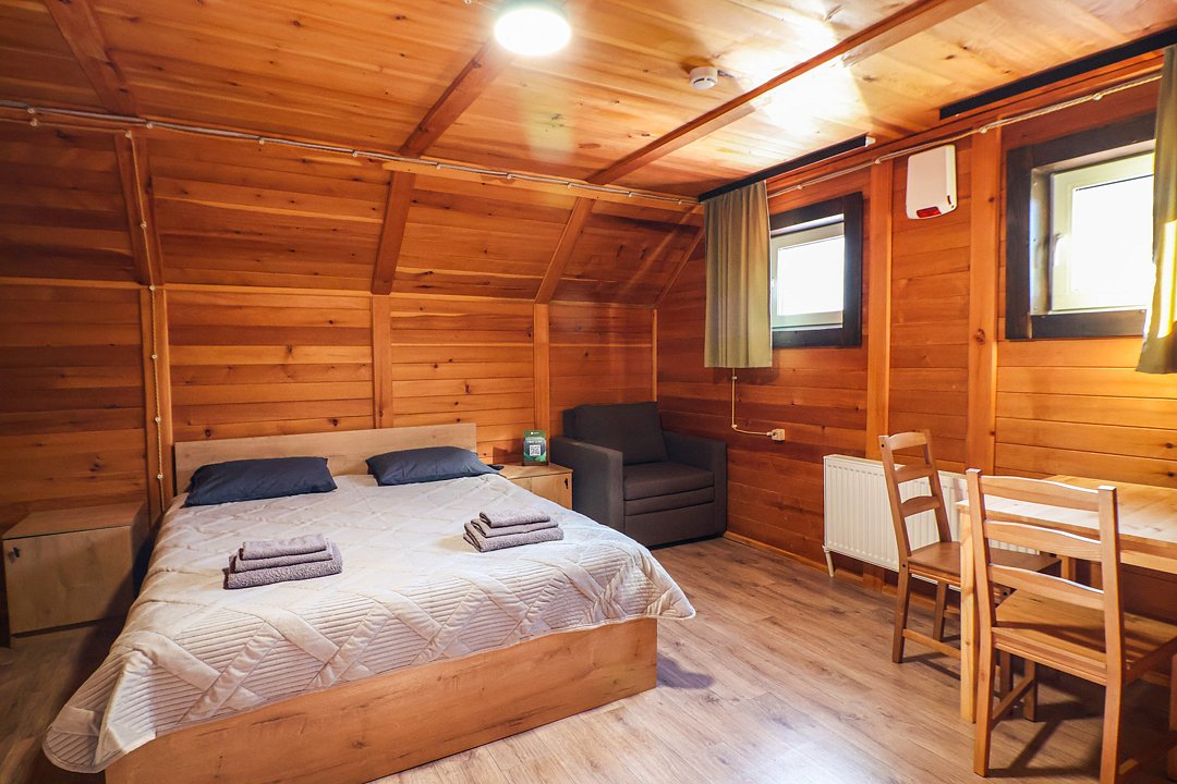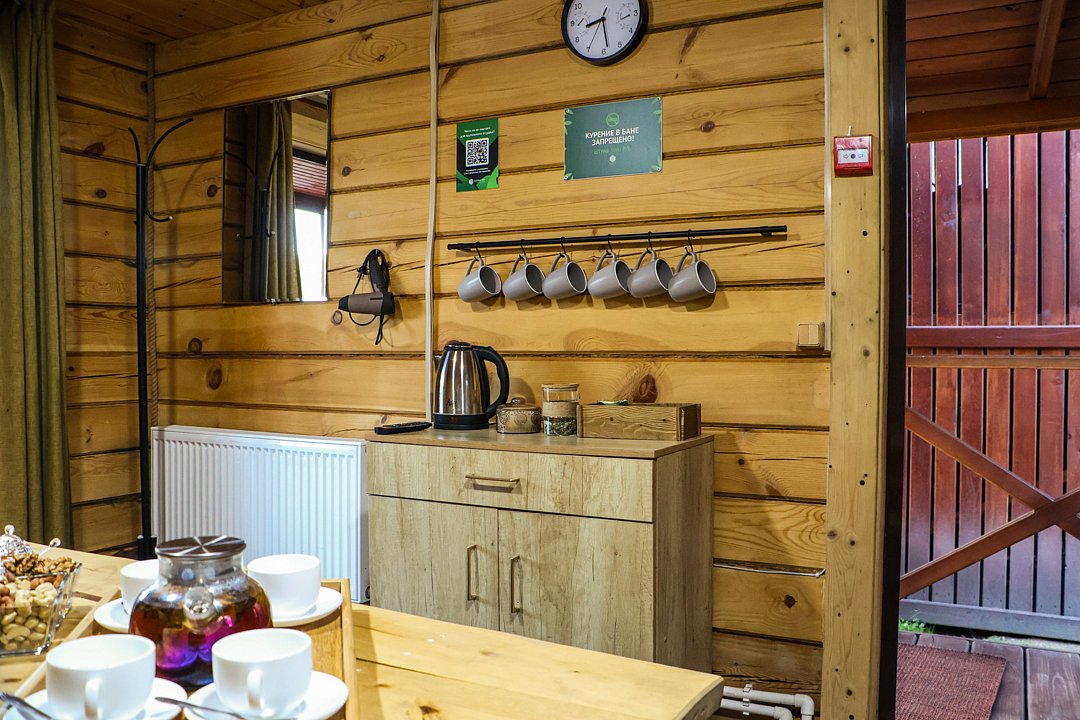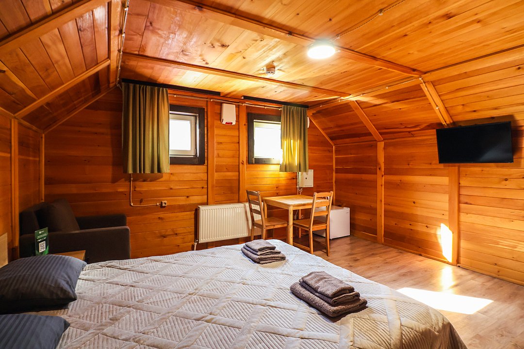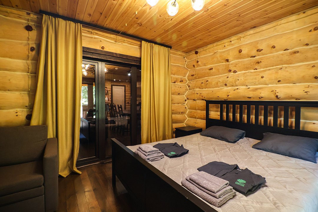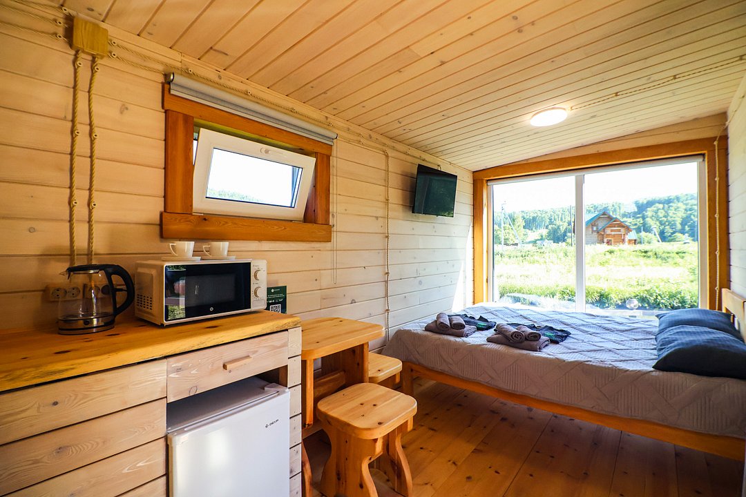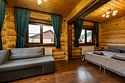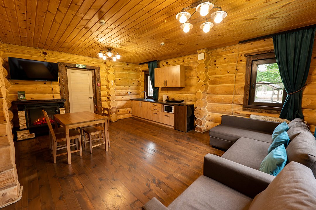 Коттедж «Шале кедровый» с большой кухней-гостиной, санузлом и спальней. В коттедже 2-спальная кровать, два дивана и кресло-кровать. Общая площадь - 70м², подходит для семьи или компании до 6 человек.