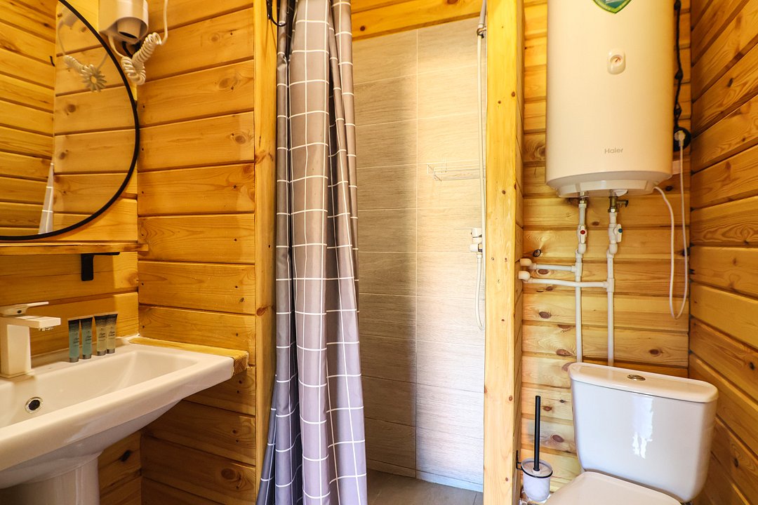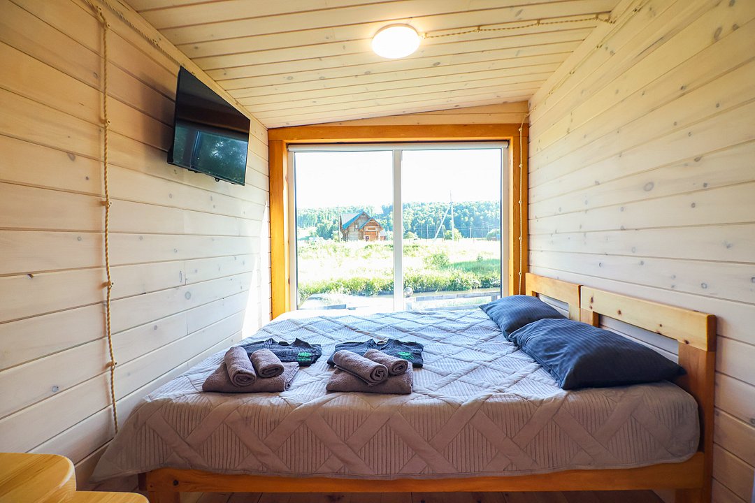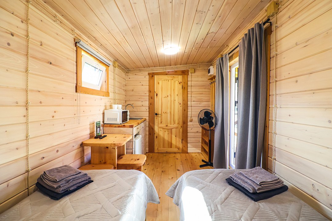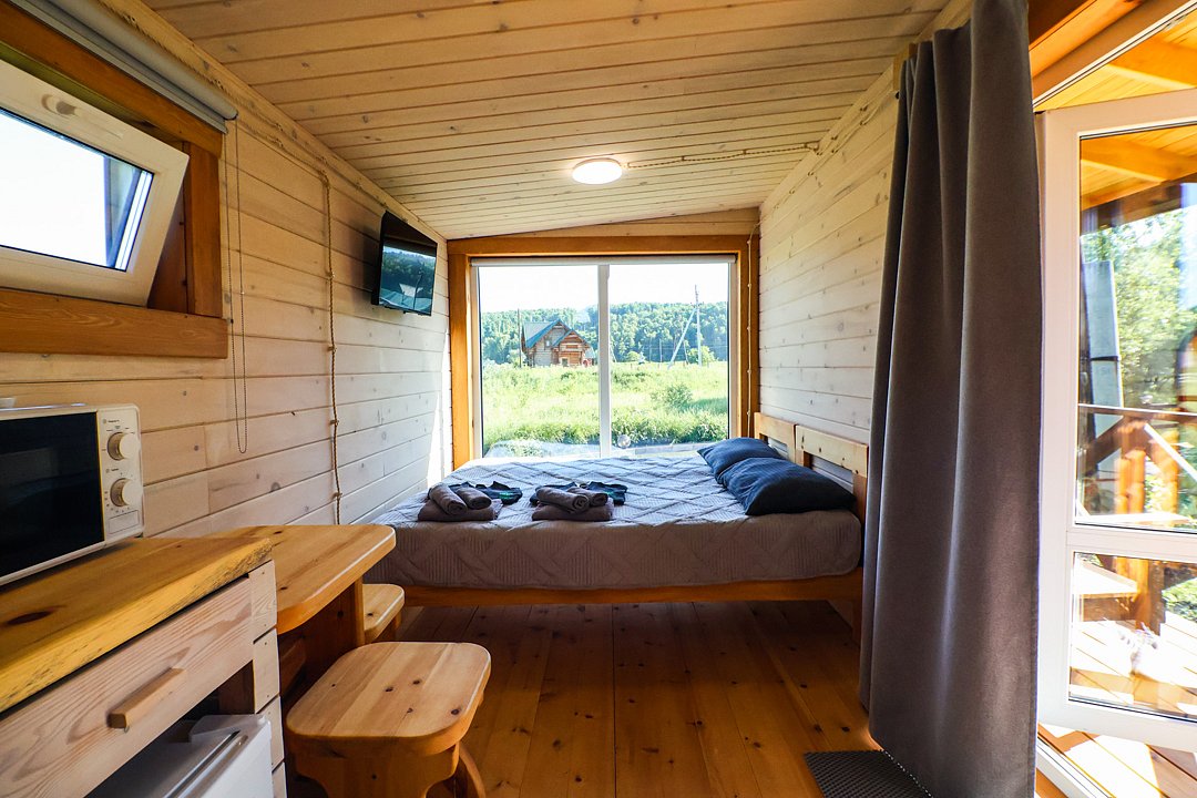 Новый дом, сезон постройки весна-лето 2025. Отдельный домик с одной большой или двумя раздельными кроватями, собственной террасой и мангальной зоной. Общая площадь - 15м², подходит для 1-2 человек.