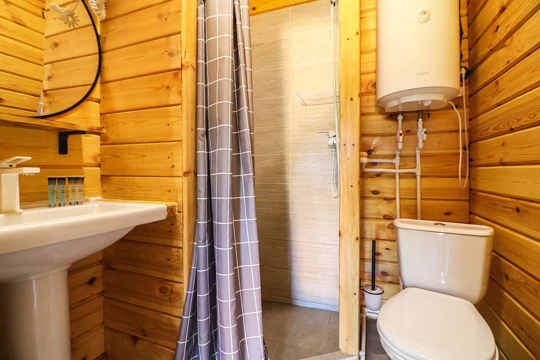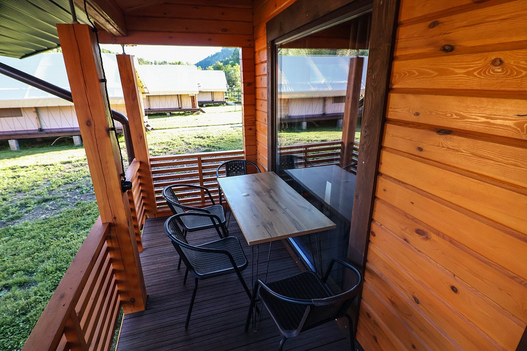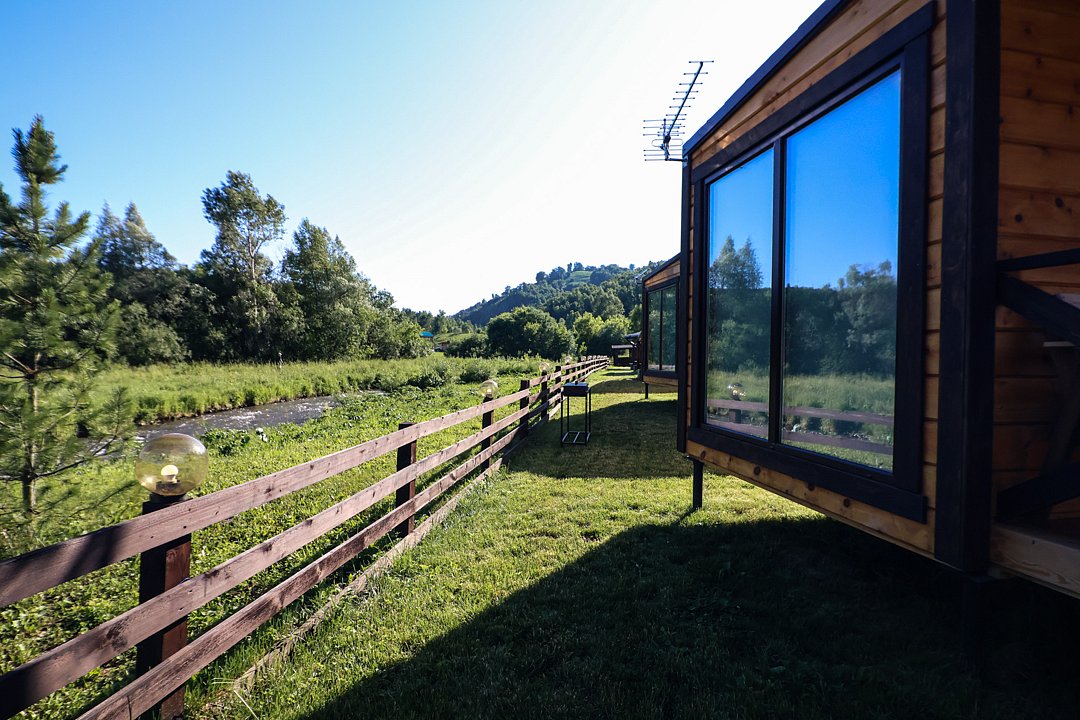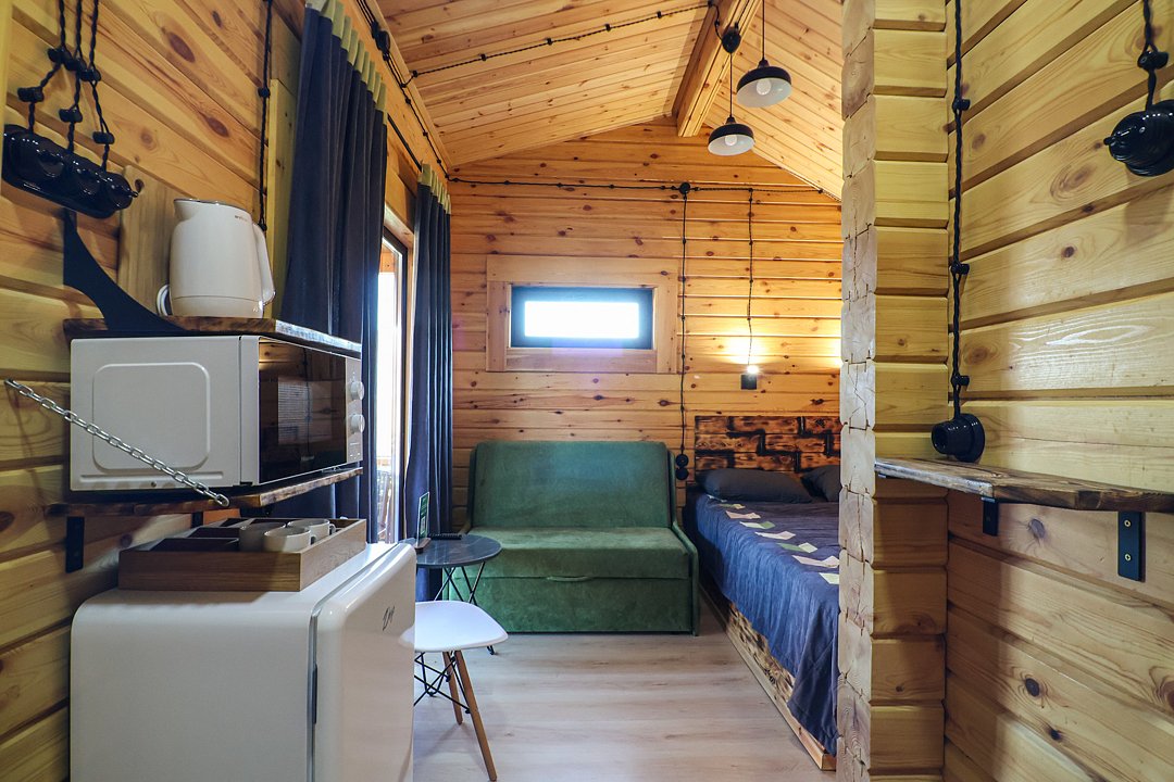 Новый дом, сезон постройки весна-лето 2025. Отдельный домик с большой кроватью и диванчиком, собственной террасой и мангальной зоной. Общая площадь - 20м², подходит для 1-3 человек.
