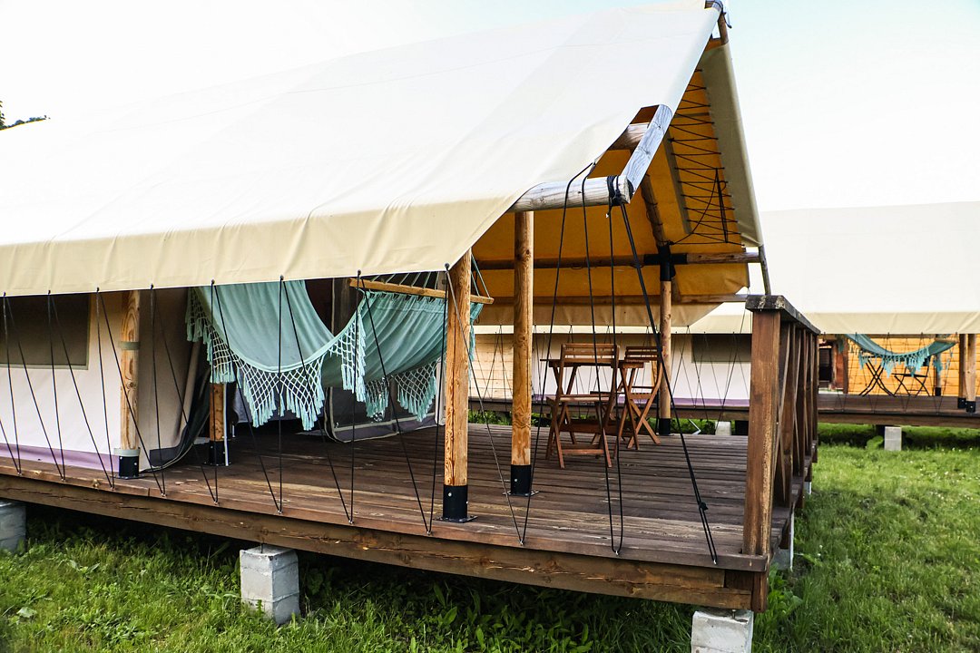 Новый сафари-тент, сезон постройки весна-лето 2025. Глэмпинговый сафари-тент с одной большой или двумя раздельными кроватями с простынями с подогревом. Собственная уединенная терраса с мебелью и гамаком и мангальная зона. Общая площадь - 24м², подходит для 1-3 человек.