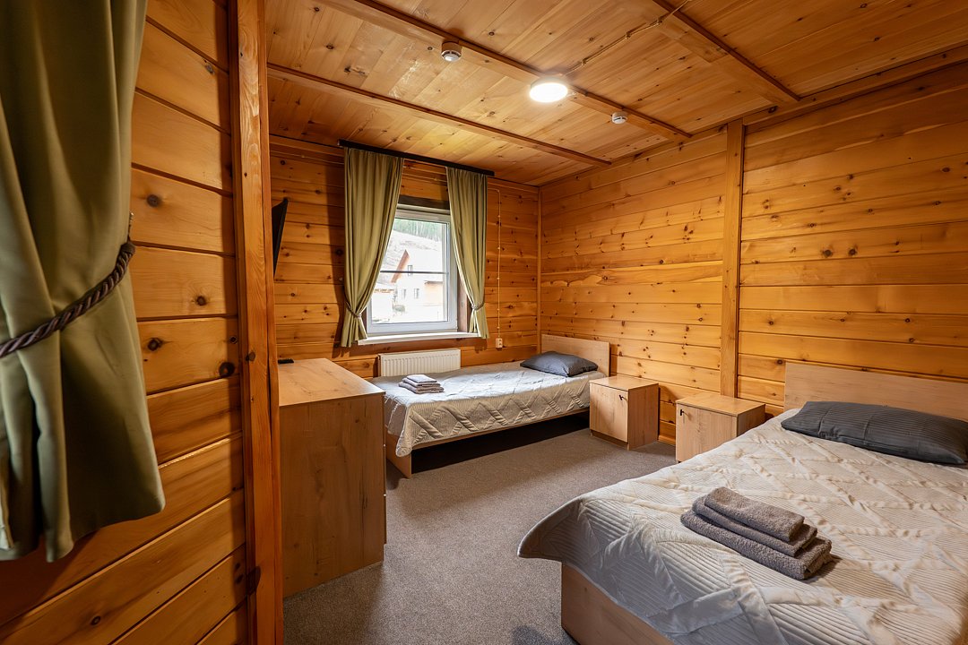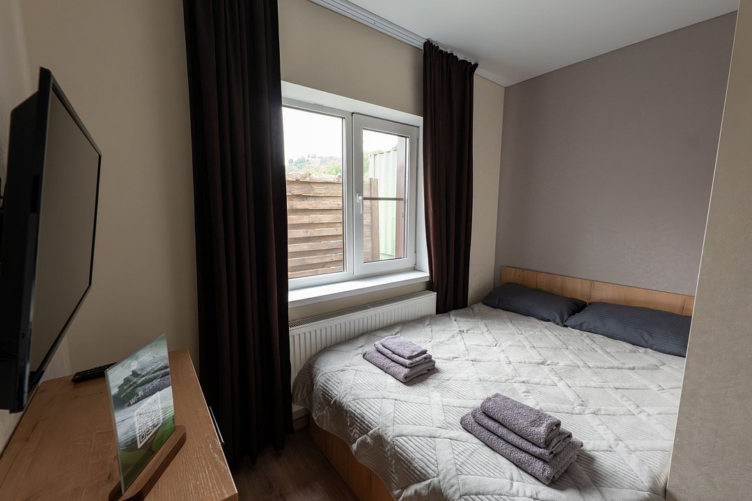 Номер категории «Комфорт» с 2-спальной кроватью и креслом-кроватью. Общая площадь номера 25м², подходит для 2-3 человек. Расположен на 2 этаже в коттедже на несколько номеров, санузел в отдельном помещении (на первом этаже, только для этого номера). Есть возможность забронировать весь коттедж целиком.