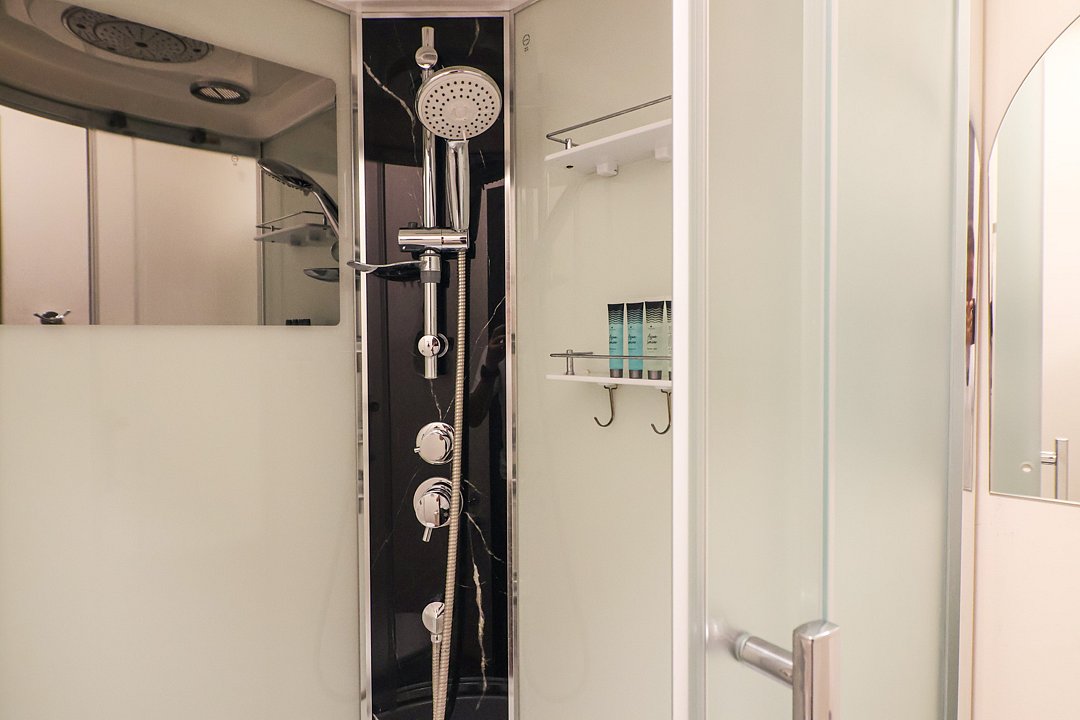 В номере: — Двуспальная кровать или две раздельные кровати; — Прикроватные тумбы; — Санузел с душевой комнатой; — Комод; — Прихожая; — Телевизор; — Электрочайник — Холодильник.