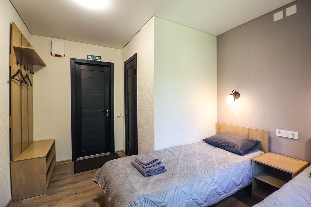 Номер категории «Комфорт» с двумя раздельными кроватями. Общая площадь номера 20м², подходит для 1-2 человек. Расположен на первом этаже в коттедже на несколько номеров, санузел в отдельном помещении (соседняя дверь, только для этого номера). Есть возможность забронировать весь коттедж целиком.