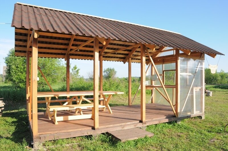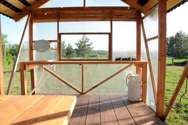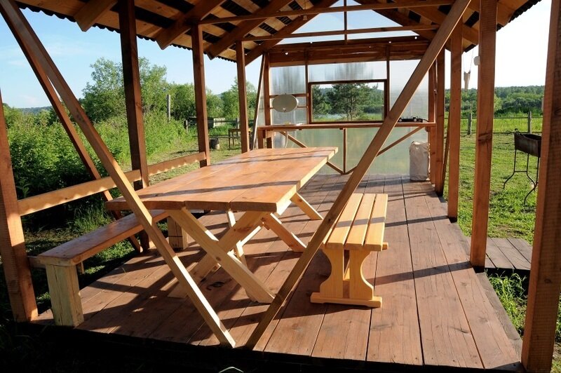 Беседка деревянная открытая с хорошим панорамным обзором. Подветренная сторона защищена оргалитом, что позволяет готовить пищу в любую даже ветреную погоду на газовой плите. Есть раковина для мытья посуды, вода холодная, освещение и подсветка рабочей зоны.